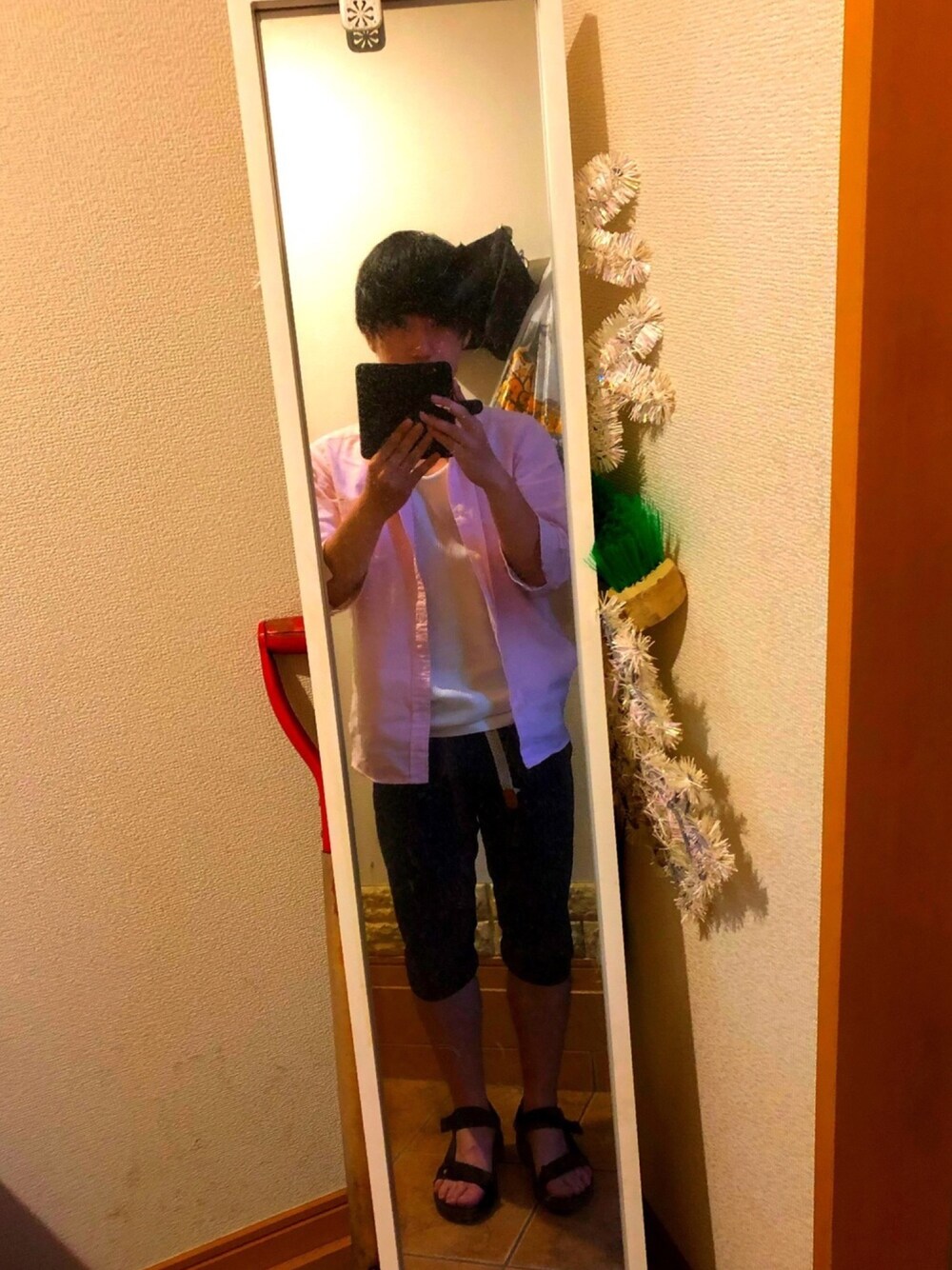 夏コーデ トップスは ピンクのシャツに中は白のタンクトップ ボトムスはトップスのピンクに合う紺色の短パン 靴は夏らしいサンダル