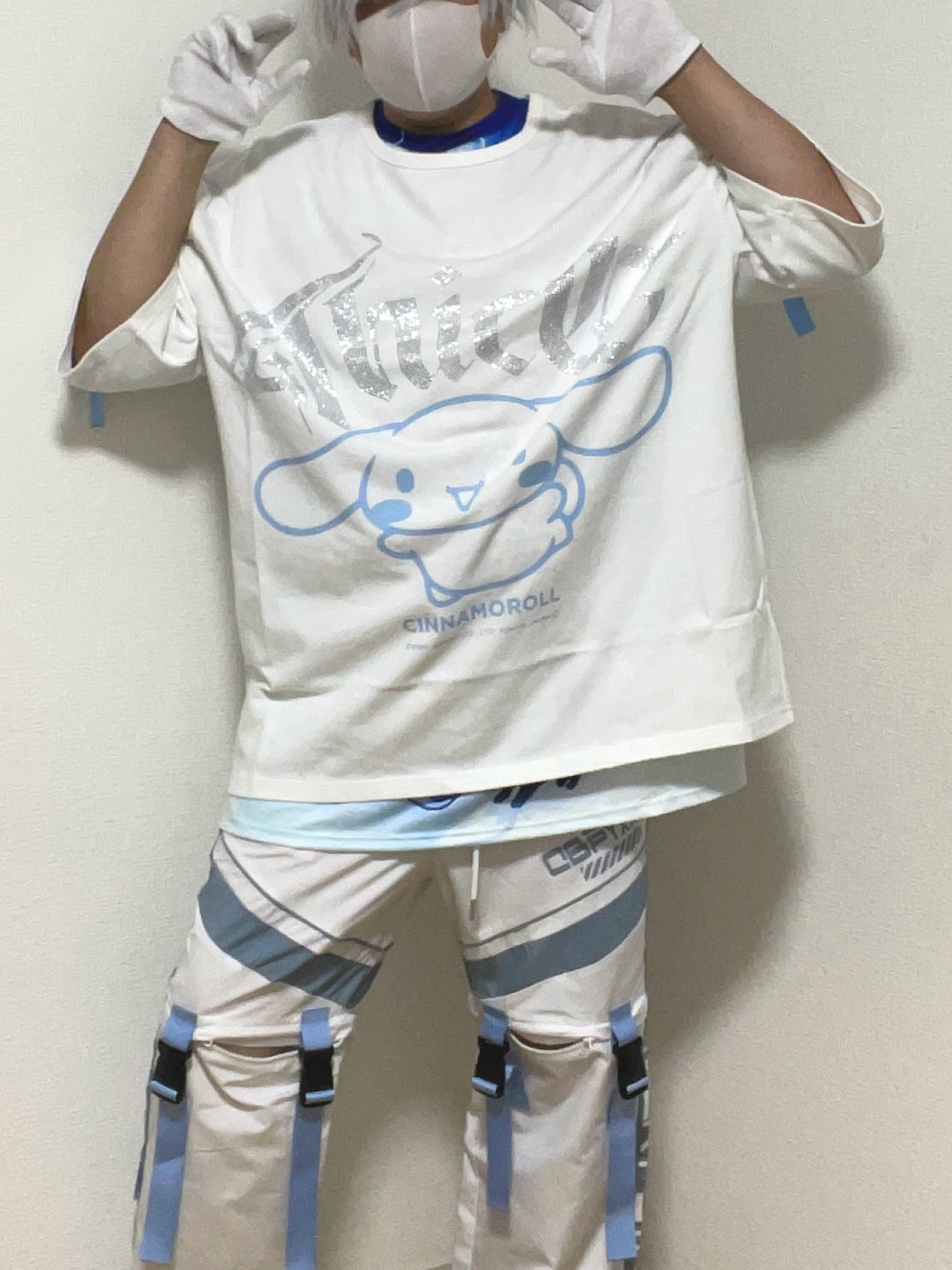 【PSYNYXX原宿店さんでサンリオシリーズ】 ①PSYNYXXシナモロール Tシャツ ¥15000円ぐらい ②cyberパンツ ¥25000円ぐらい ※中のTシャツ=ACDCRAGさん ※だいたいの値段、お店HPで確認お願いします ※中に来ているのはACDCRAG Tシャツ 『サンリオピューロランドの衣装として使用』