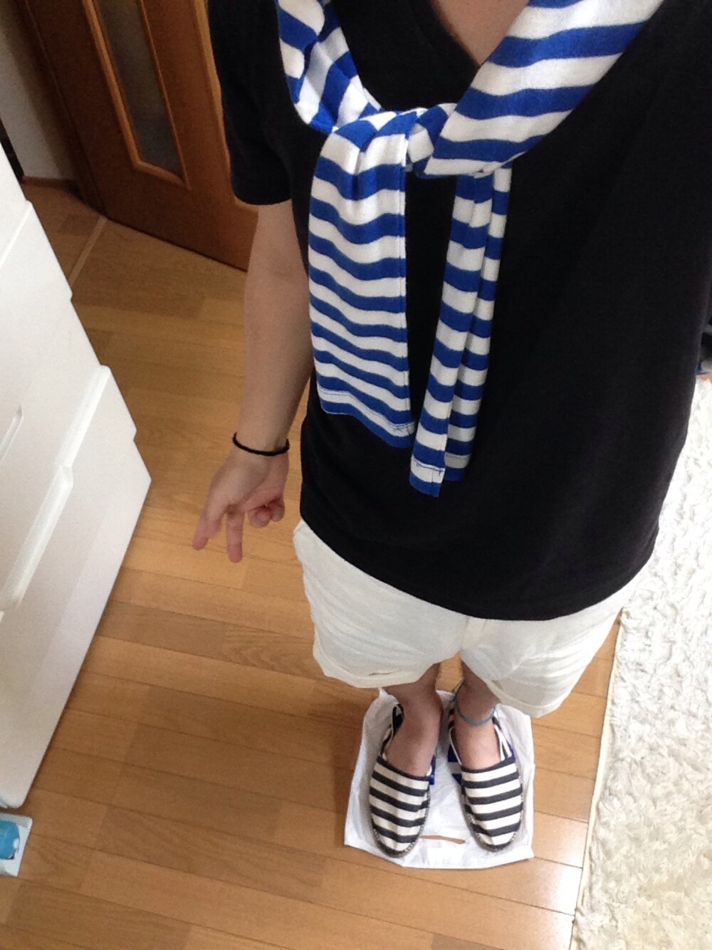暑すぎるのでショーツ&Tシャツ! 寂しいので肩掛けコーデ。