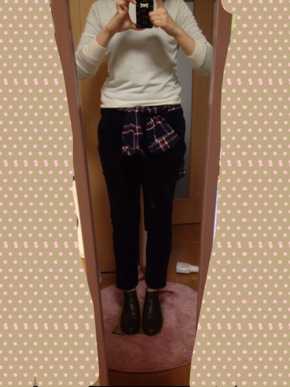 出勤コーデです、 ポイントはパンツの色がネイビーで落ちついているのでニットの白とシャツの赤を差し色にしました(^-^)/