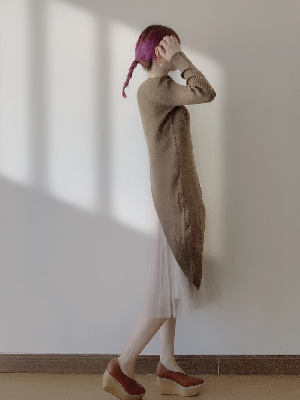 Spongeeeeのワンピース「アシンメトリーリブニットワンピース(ラウンドネックハイスリットミモレ丈ワンピース)」を使ったコーディネート