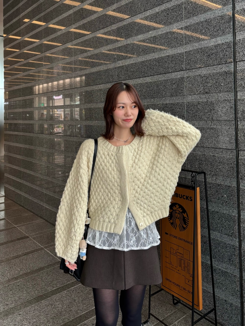 kusuda yoshiko(mystic)のカーディガン/ボレロ「【お気に入り4万6千人突破!WEB限定カラーPNK/YEL】ポコポコニットカーディガン」を使ったコーディネート