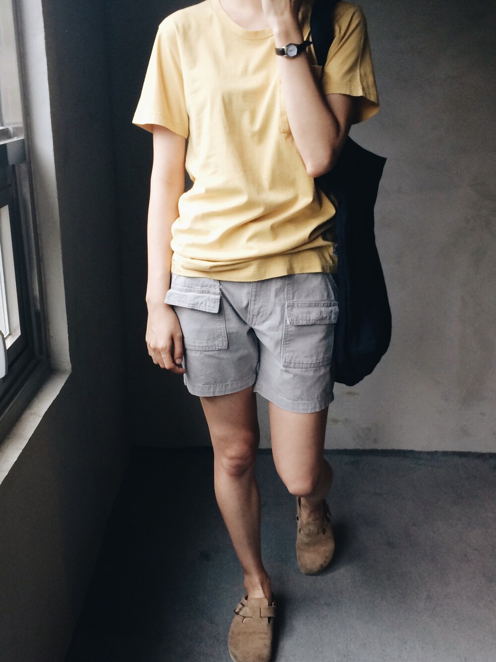 top-yellow color tee bottom-grey short pants bag-linen navy bag shoes-birkenstock boston