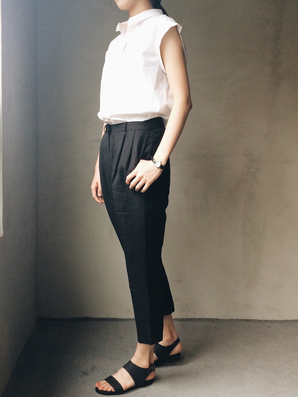 black simple linen slacks with white shirt & black sandal