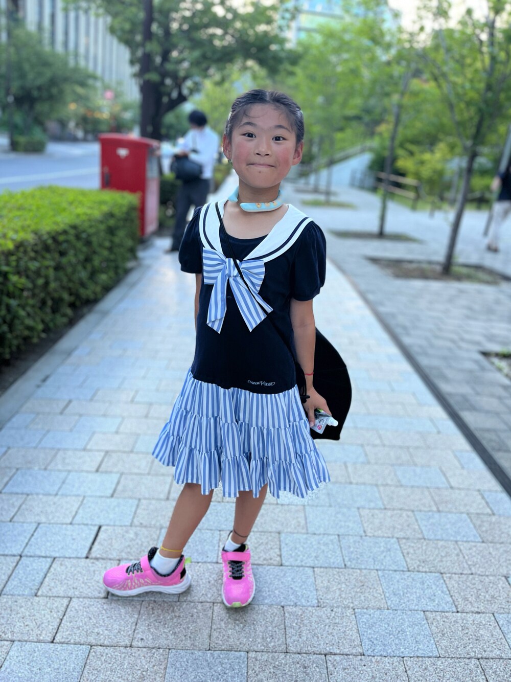 本日も振替テニスレッスン🎾の日。まだまだ振替日が溜まっています😭 終わった後に着替えたセーラーワンピ。mezzo pianoです。150サイズなので、かなり大きいですが、セーラームーン熱が冷めない娘は着たくて仕方なく、初下ろし。 プリーツスカート がふんわりで夏らしいワンピです。