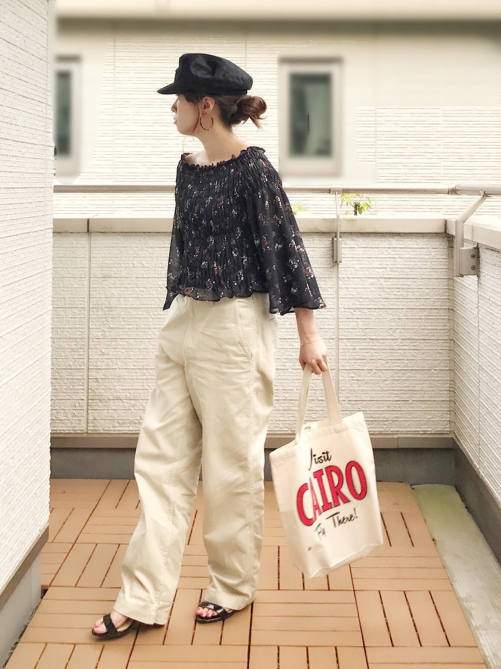 フェミニンなシフォンブラウスをチノパンとマリンキャップで甘辛に☺️ 左腕にクリアバングル(透明なアクリルの筒😅)をしているのにこの写真だと全く見えてない🙈💦