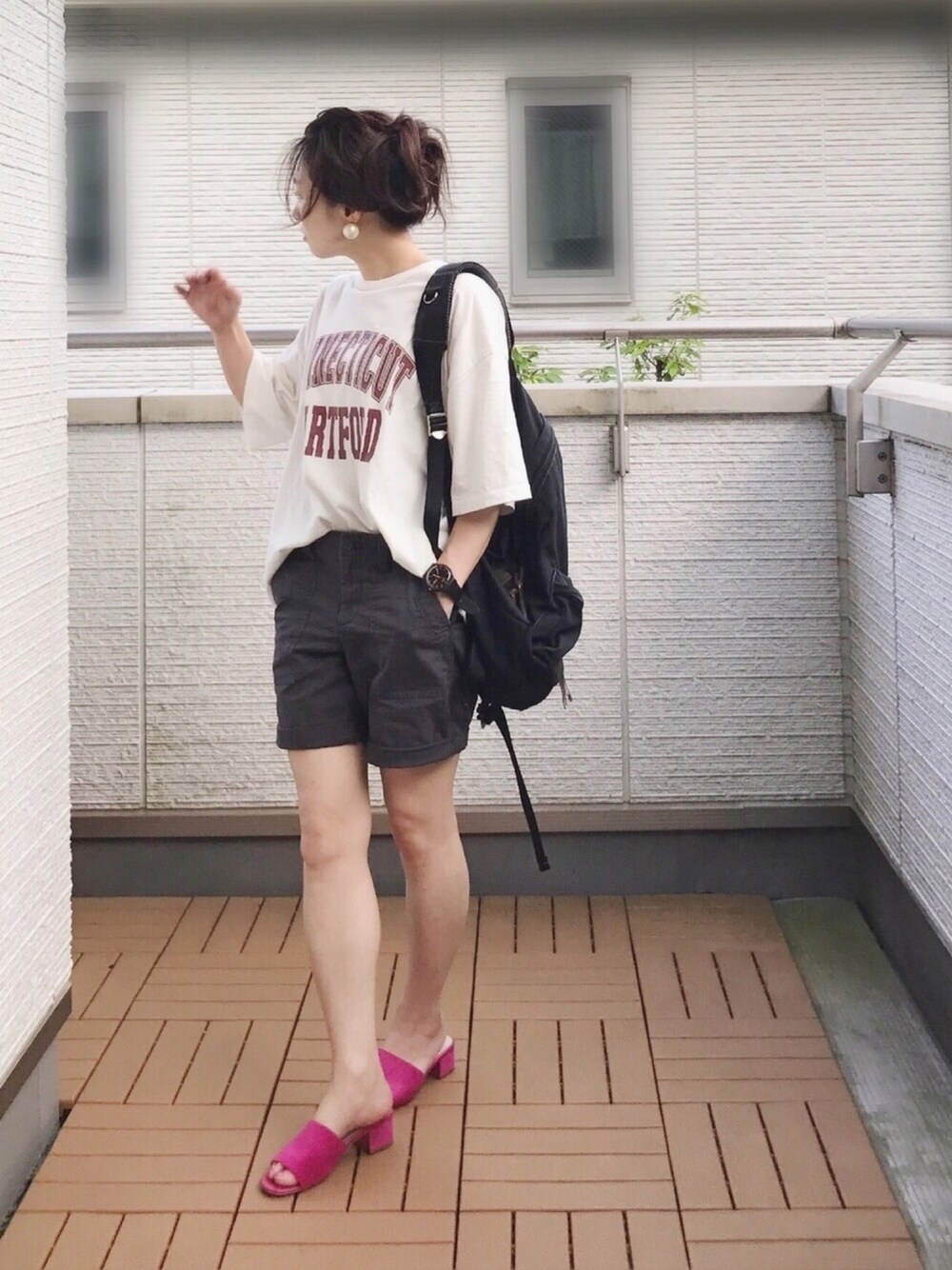 どうしようもなく暑い日はショーパンに頼るしかない😂 GAPのガールフレンドユーティリティショートパンツを履いてみました😊 黒をチョイスしましたが、ヴィンテージ加工になっていて真っ黒というよりは濃いめのチャコールなのが風合いあって気に入りました♡ ショートパンツでもそんなに短くないので大人でも履きやすい🙌 今回はロゴTにリュックでスポーティー合わせに スニーカーではなく敢えてサンダル合わせで女子力☺️