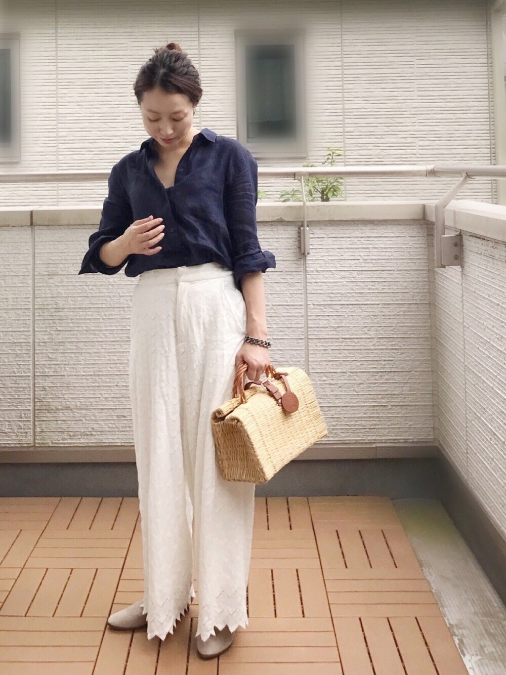 ネイビーのリネンシャツは晩夏から秋の初め頃まで活躍してくれそう✨ オーバーサイズで涼しいし襟抜きして着るにも最適でした🙌 たまにはちょっときれいめスタイルで😊
