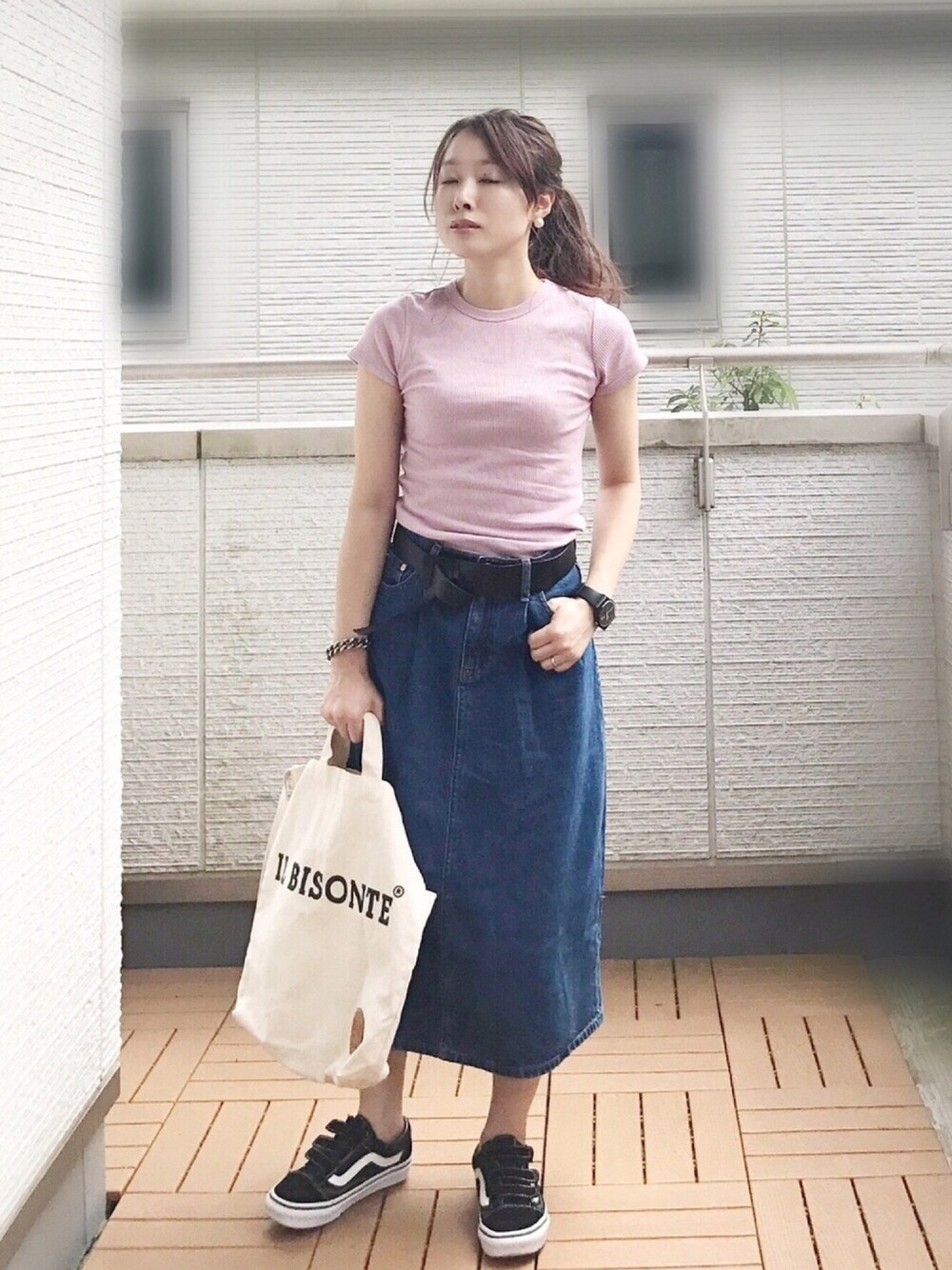 GAP新作、ハイライズAラインデニムスカート シンプルなAラインにさりげないサイドのタックが今の気分👍 去年のピンクのUNIQLOリブTに合わせてみました😚 Todayfulのベルトは金具がなくベルト本体の穴に通して結ぶデザインがちょっと変わっててお気に入りです💕