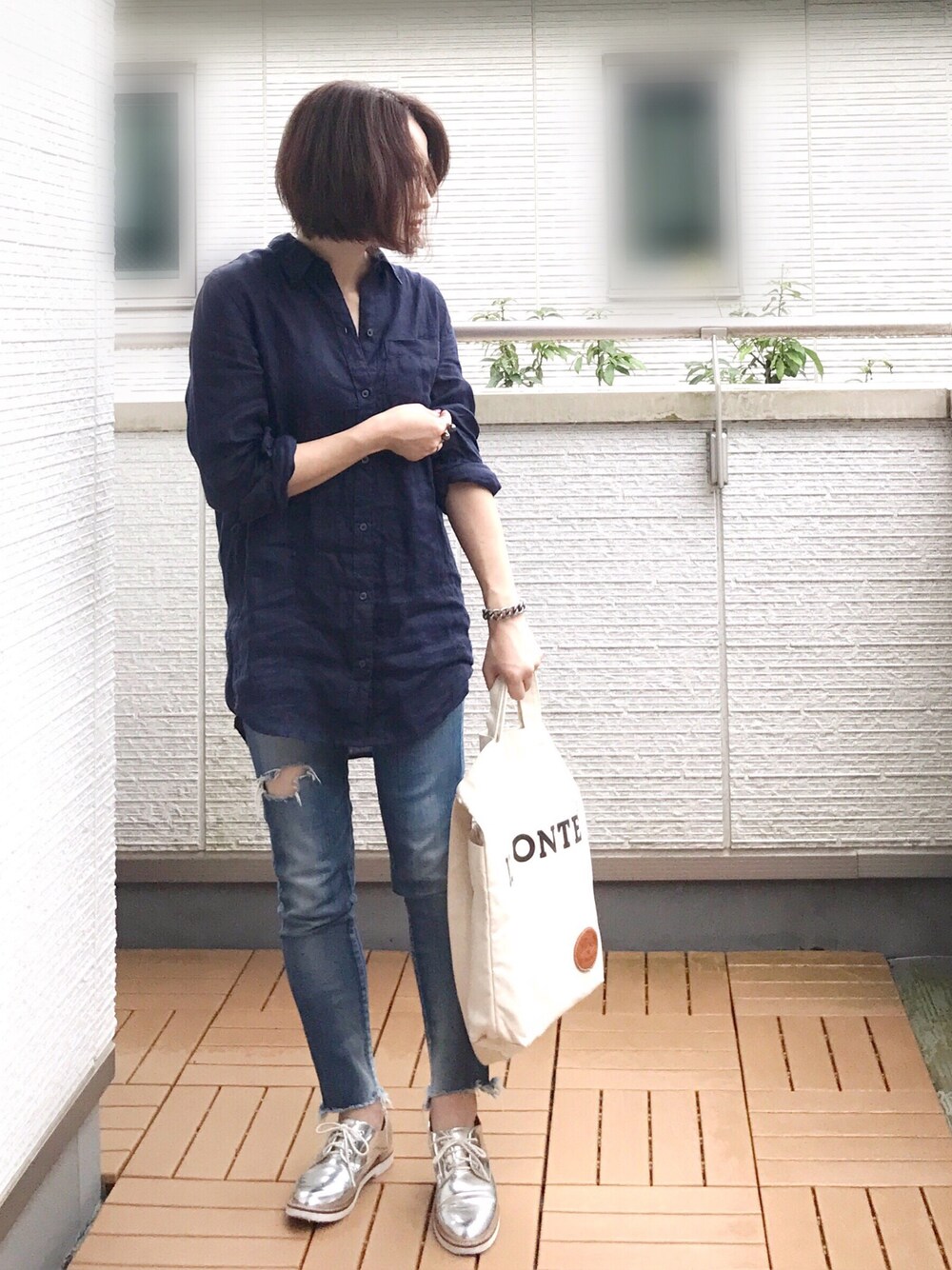 ネイビーのリネンシャツにフレイドヘムのスキニー 今年何度となくやっている定番の大好きな合わせ方✨ 毎回違う小物を合わせて少しづつ変えたりして遊んでました😚 今回はシルバー小物盛り✨
