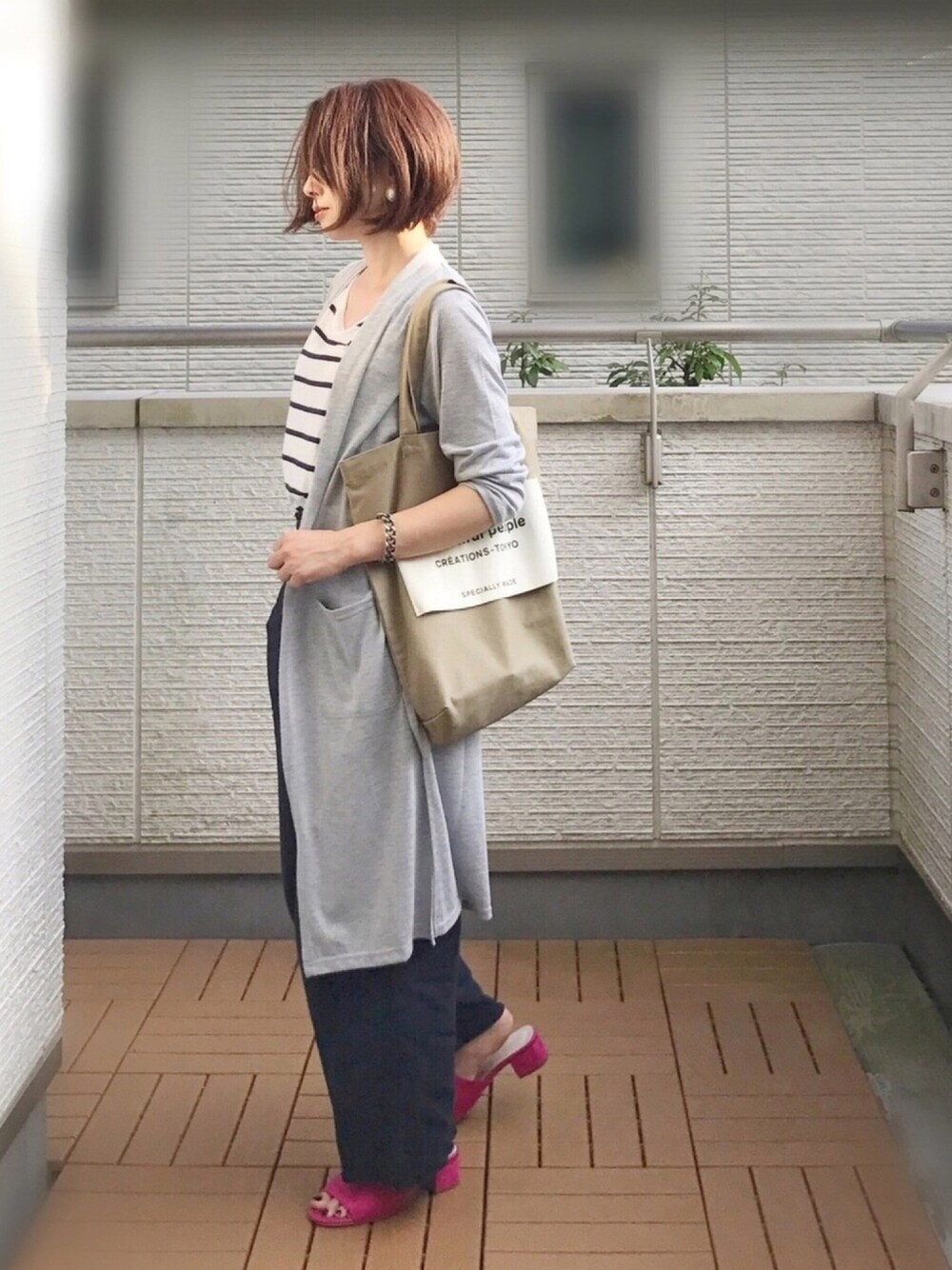 ネイビー×グレーにビビッドピンク差し この時期Tシャツにカーデの組み合わせが快適過ぎていつもこんな感じに😅 日中暑くなる日は脱いでも嵩張らない薄手のやつが便利✨