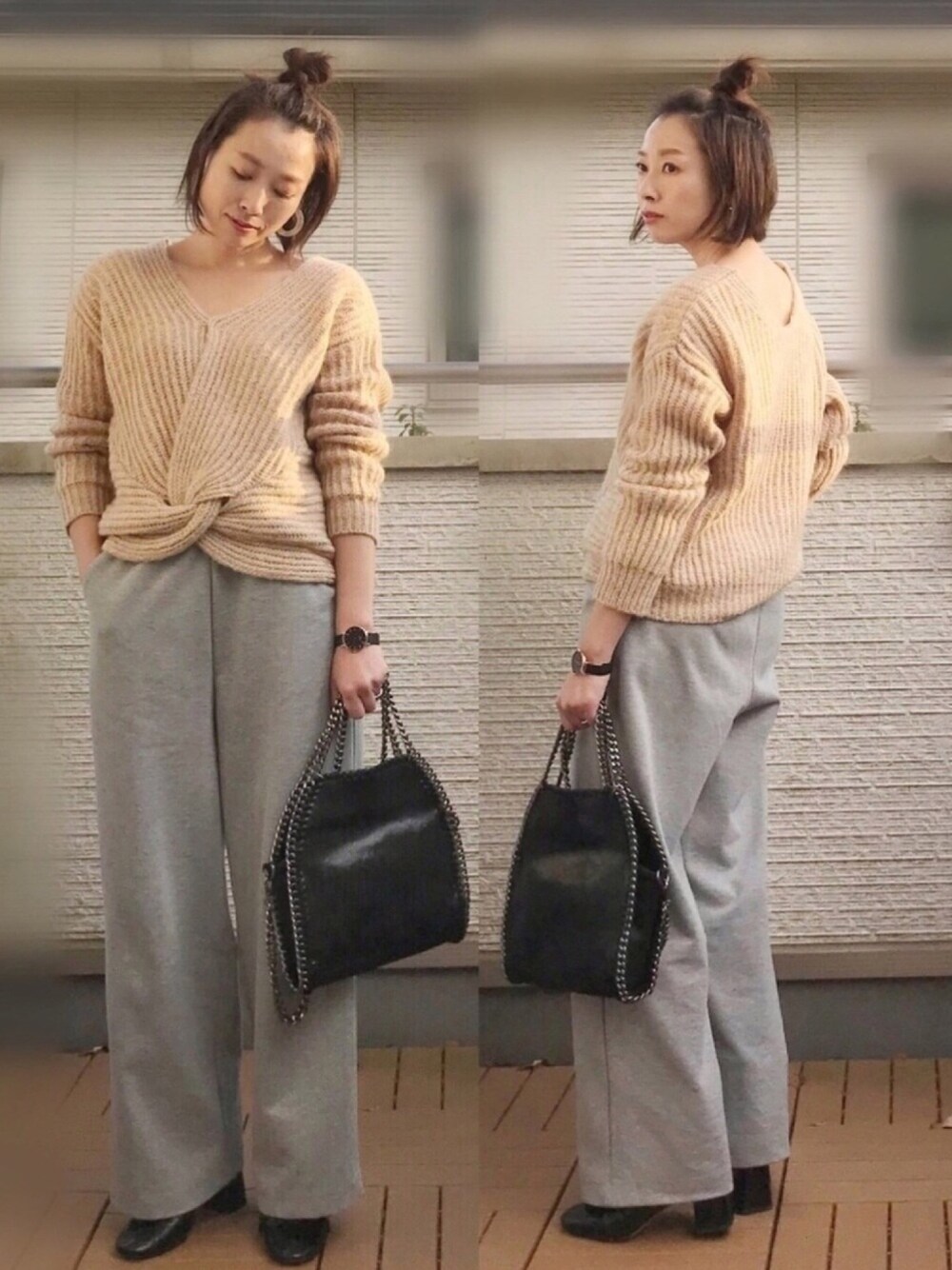 Furryrate様から頂いたニット ミックス糸の風合いがとても素敵✨ ふわふわで温かいので着心地も◎ これ前後を入れ替えて2WAYで着ることができるんです♪ 今回はツイストデザインの方を前に持ってきましたが、逆にして背中美人にもなれちゃいます😁✨ リラックス感のあるワイドパンツと合わせてゆるゆる〜 なので、黒の小物で締めてみました😊