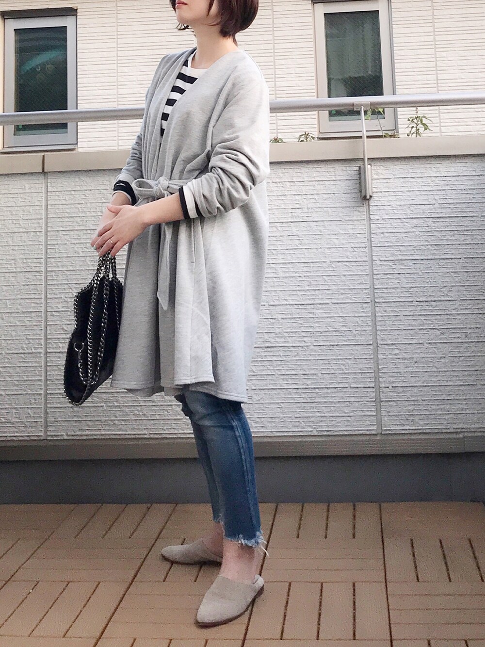 furryrateのトッパーカーディガンは季節の変わり目の羽織りにピッタリ✨ 生地が多めでゆったりとしたドレープ感が大人な印象ですがスウェット地なのでカジュアル感もありとても着回し易いアイテムだと思いました😊👍 インに着たボーダーTと一緒にラフに腕まくり♪