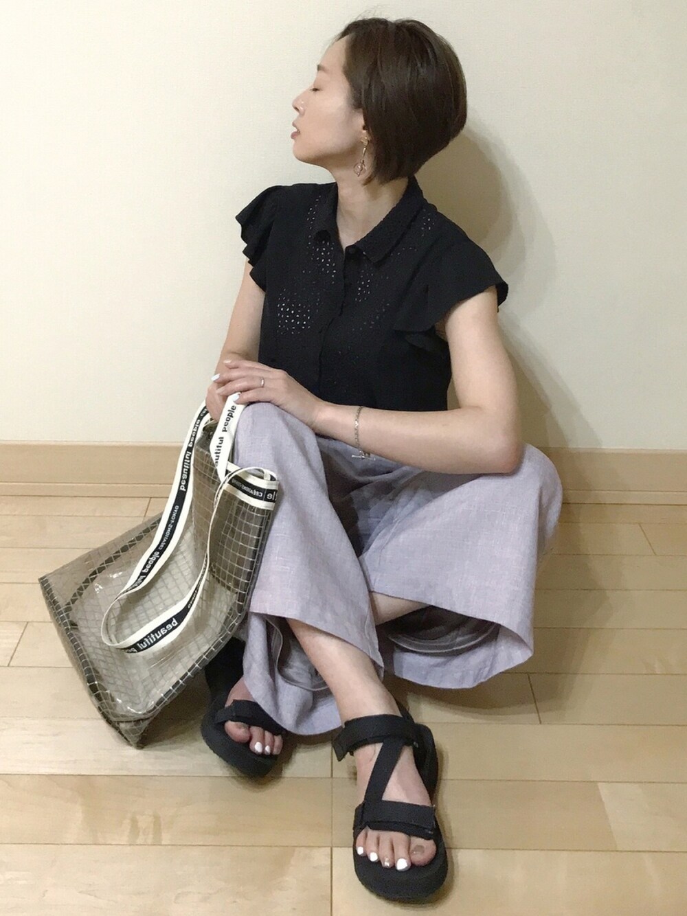 GOLDYさんのレトロアンティークピアス シルバーパーツにクリアピンク(ライトパープル??)がとても涼し気でこれからの季節に大活躍しそうです😊 ラベンダーカラーのパンツとリンクさせてみました✨