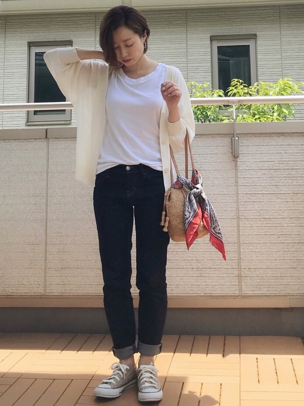 furryrateさんのエステルレーヨンVネックカーデ 余裕のあるシルエット 歩くと風が抜けて涼しいです✨ ノースリなどの露出度を調整、日焼け対策、冷房対策に👍 お家で手洗いできるのも嬉しい✨ 白T×デニムのシンプル合わせにバッグにスカーフ巻いてポイントにしてみました😊