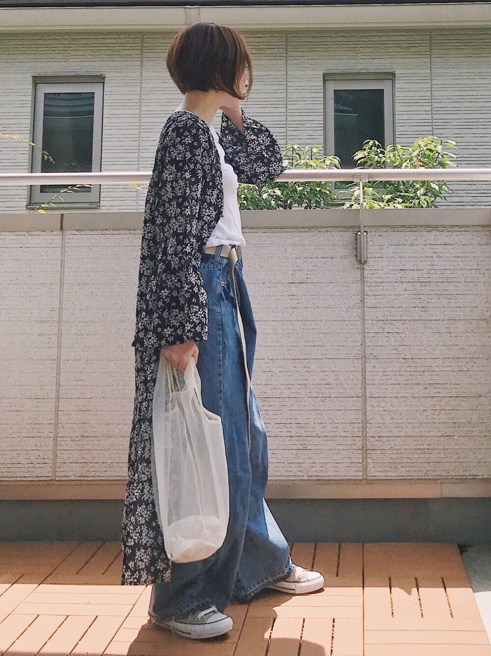超ワイドなデニムにロングガウン 花柄のこんな感じのやつ何気に初挑戦 チビなので大柄過ぎは似合わないけどこれは柄の具合が丁度いい✨ 薄手のノースリTにさらり☺️