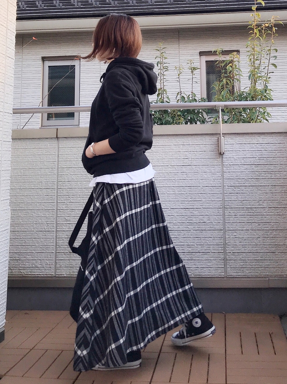 SENSE OF PLACEのチェックフレアロングスカート 丈感もボリュームも丁度いい🙆♀️✨ 温かみのある起毛素材◎ パーカー×ロングスカートは定番😊 モノトーンでカッコよい感じにしてみた✨