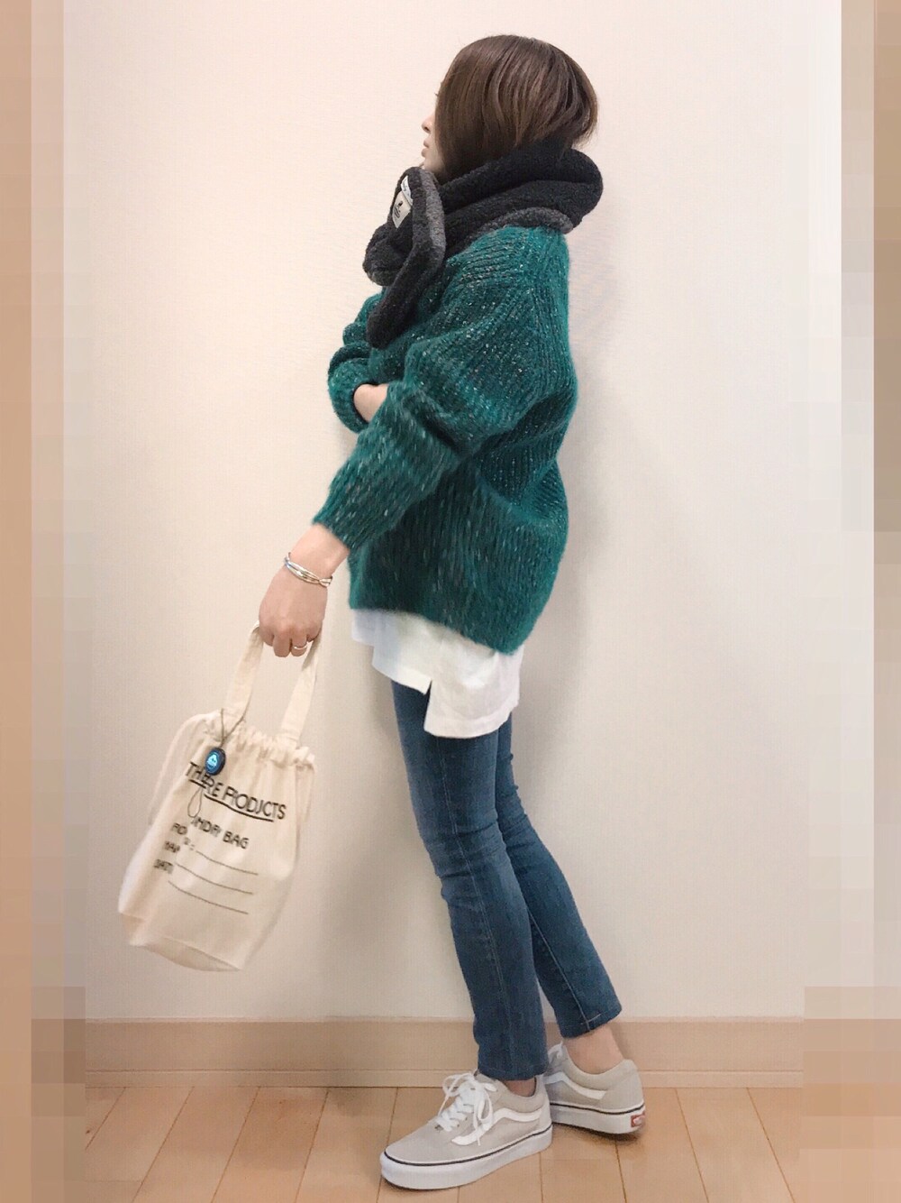 お気に入りのグリーンニットとボアマフラー☺️