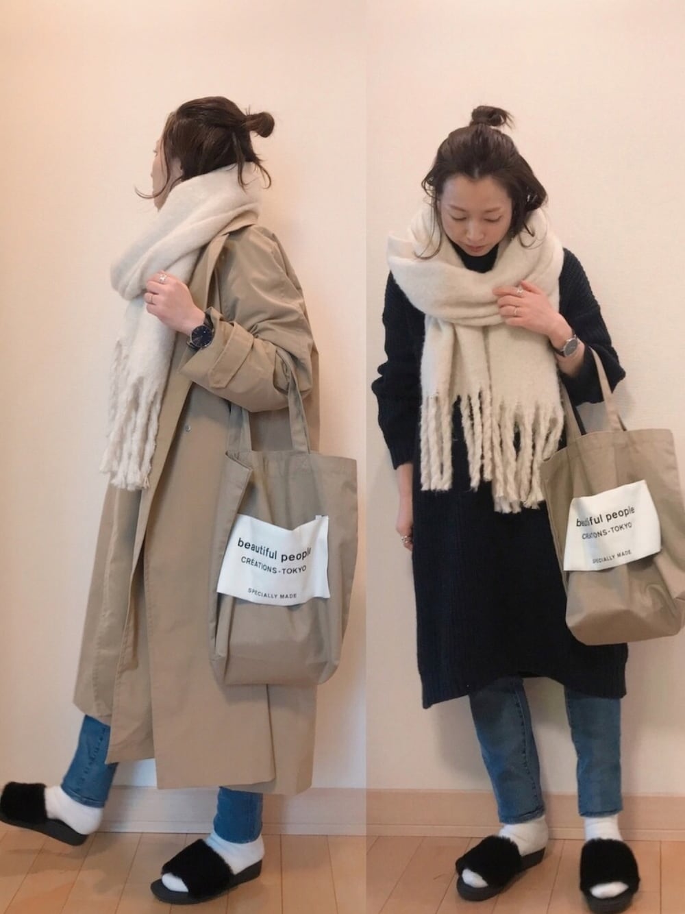 ニットワンピにデニムの温かスタイル🔥 シンプルコーデにファーサンダルのアクセント😊