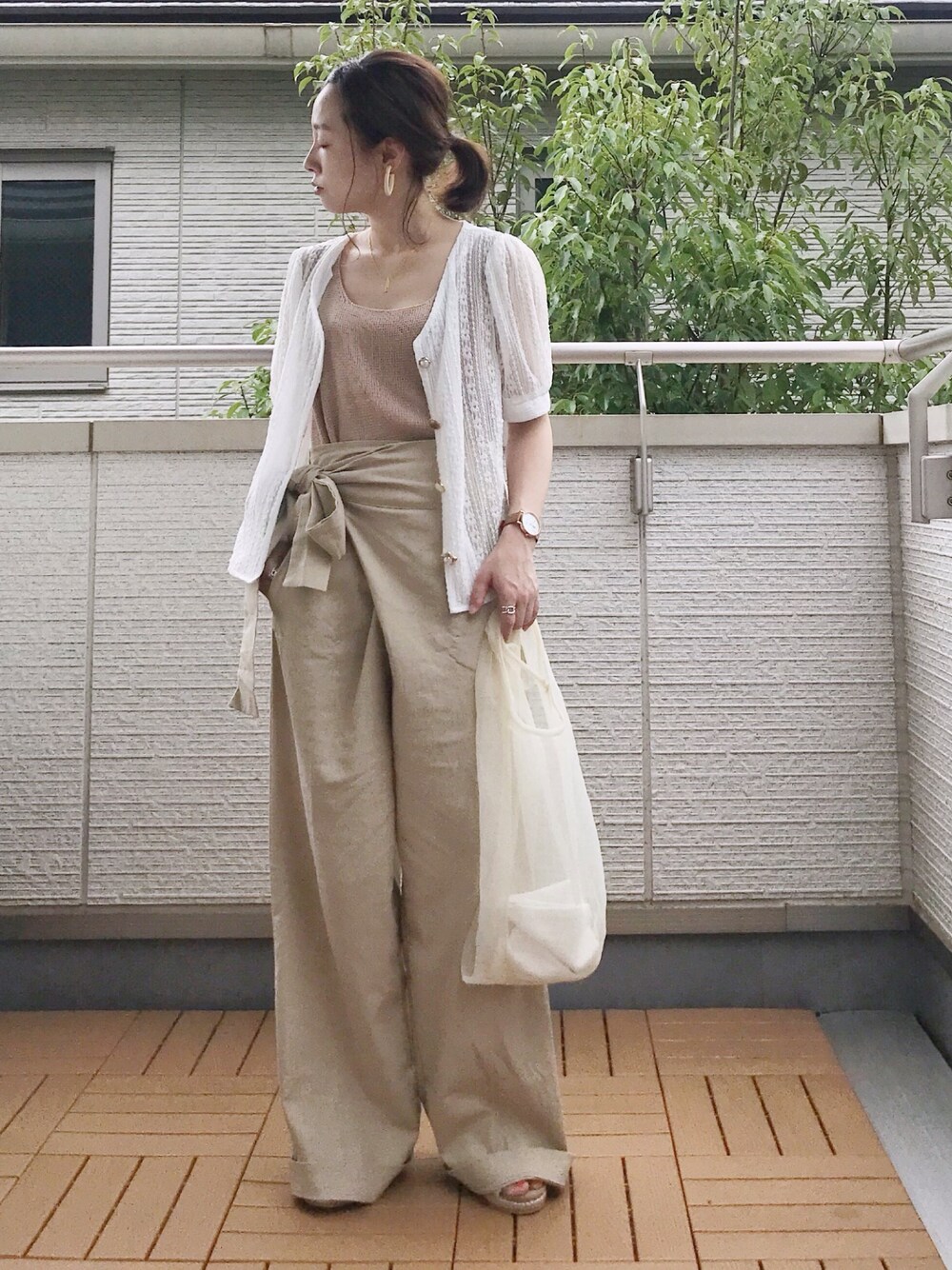 La-gemme のリネンラップパンツ めちゃ優秀な美脚パンツ✨ リネン混の涼素材で暑くても快適😊 身長150㎝の私だと裾をひと折りして7㎝ヒールを仕込んでこんな感じ😚