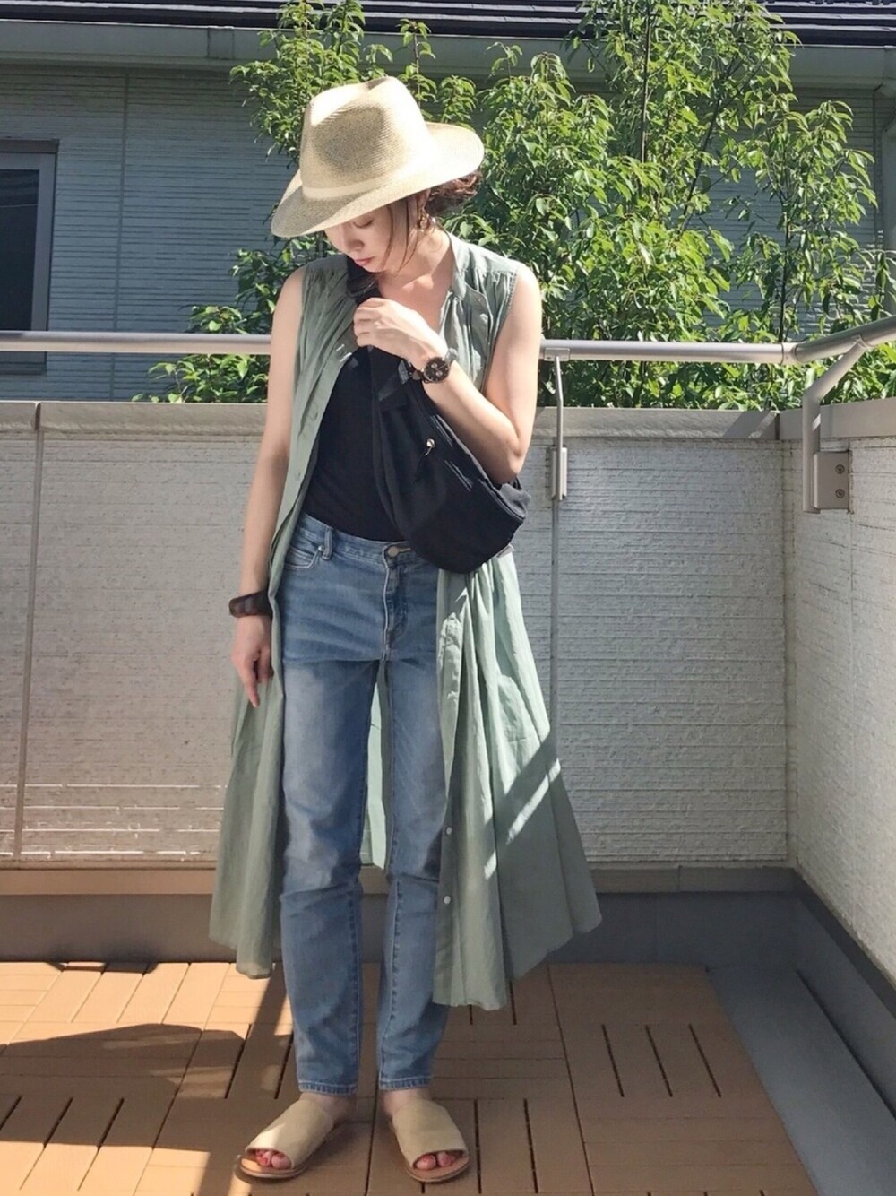 タンクトップにノースリワンピ👗 この組み合わせ過度な露出を避けつつ涼しいから大好き🙌❤️ 肌馴染みのよいくすみミントグリーンがお気に入りのノースリワンピはSonny Label のもの 羽織りとしてもワンピとしても使えるから着回し出来る😊
