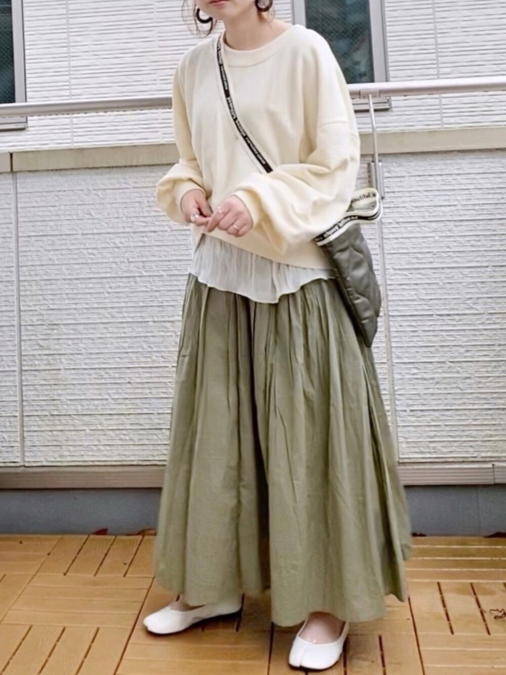 カーキ×ホワイト rpsのコットンボイルロングスカート✨ ふんわり軽くて程よいボリューム◎ プチプラ&カラーバリエーションが豊富なので挑戦カラーもいいかも😊✨ 私は近頃気になるカーキをセレクト✨