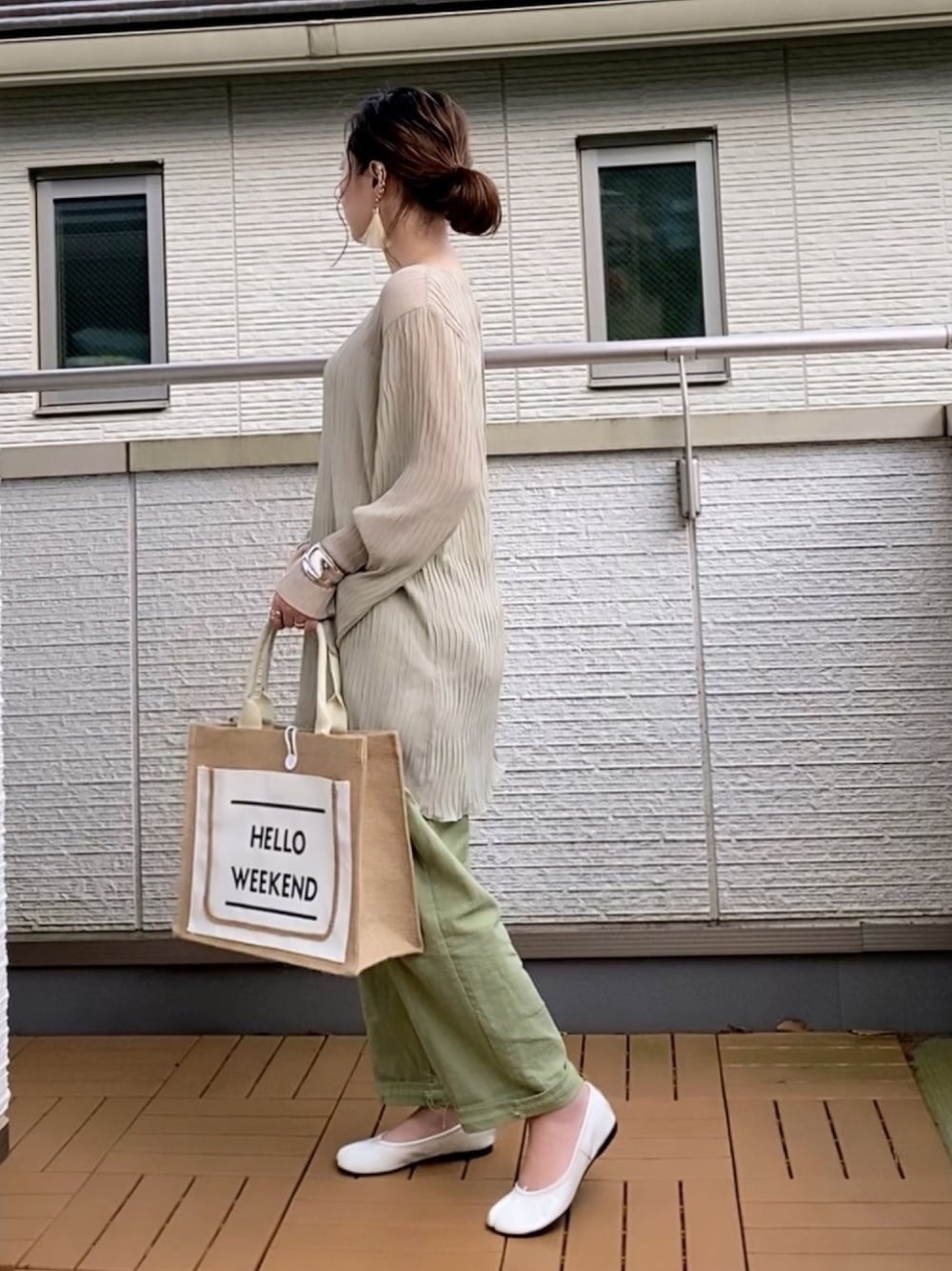 6/12に新規Openブランド”VACANCY “(ヴァカンシー)のシフォン楊柳チュニック✨ ゆったりしててストンと落ちる楊柳の質感が大人っぽい😊❤️ コーデは上下グリーンでチュニックの縦長シルエットを生かしてみたつもり☺️