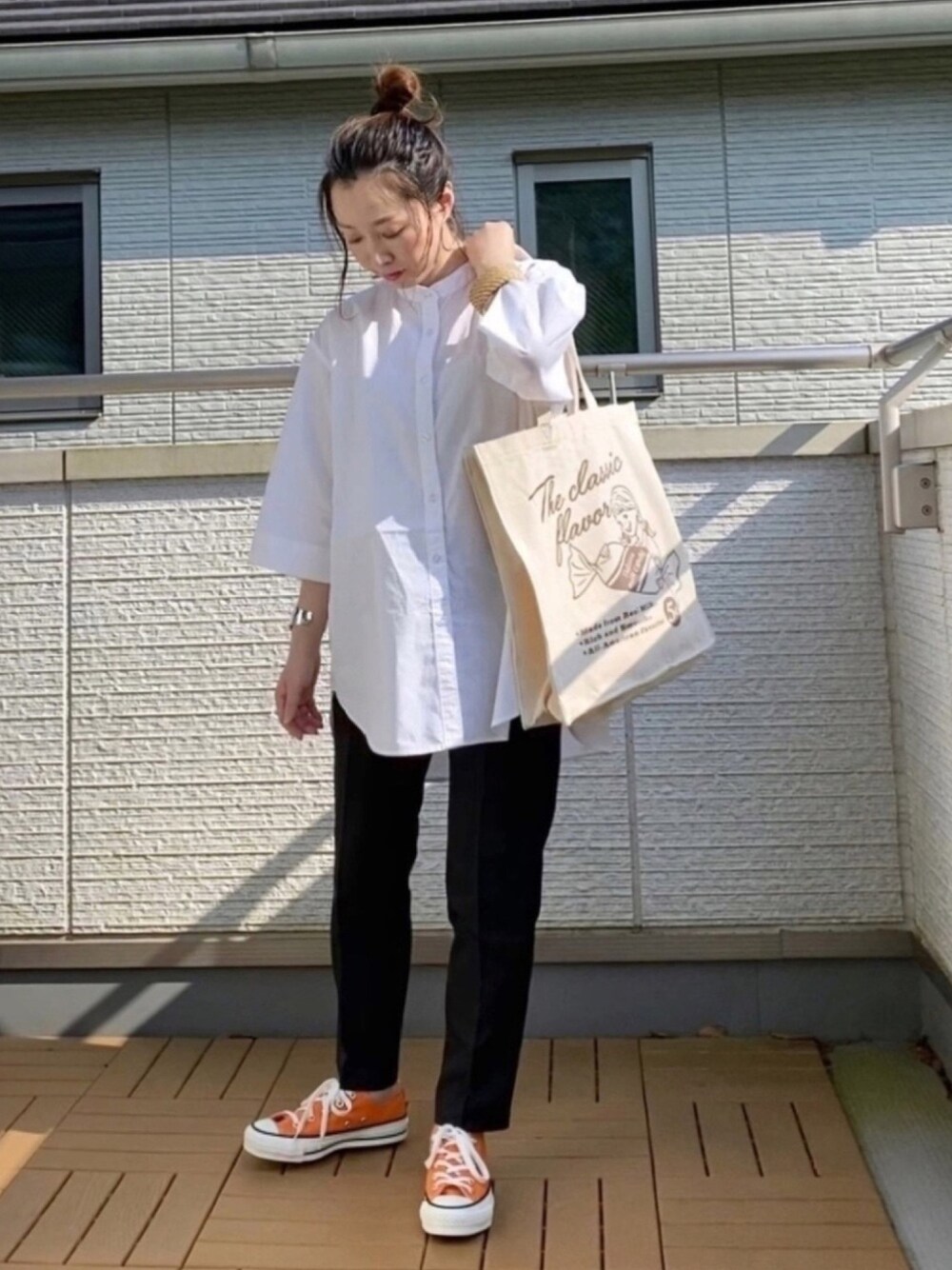 coenのブロードバンドカラーショートスリーブシャツ👚 WEB限定✨ 袖の太さと丈が絶妙なヌケ感😍 シャツだけどカチッとし過ぎないのが嬉しい🙌 シンプルコーデにオレンジCONVERSE🍊 細身スラックス合わせでちょっとだけ大人っぽく😊✨