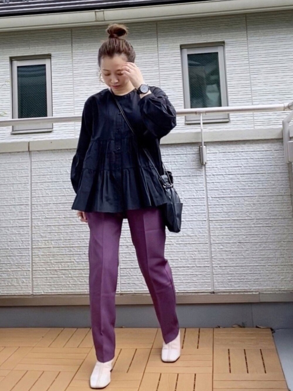 ふんわり袖にティアードで美シルエットのブラウスはrecaのやつ🥰 パープルのカラーパンツ欲しくてDholicで見つけてきた😊✨ プチプラなのにシルエット綺麗で着心地よくて気に入った🙌
