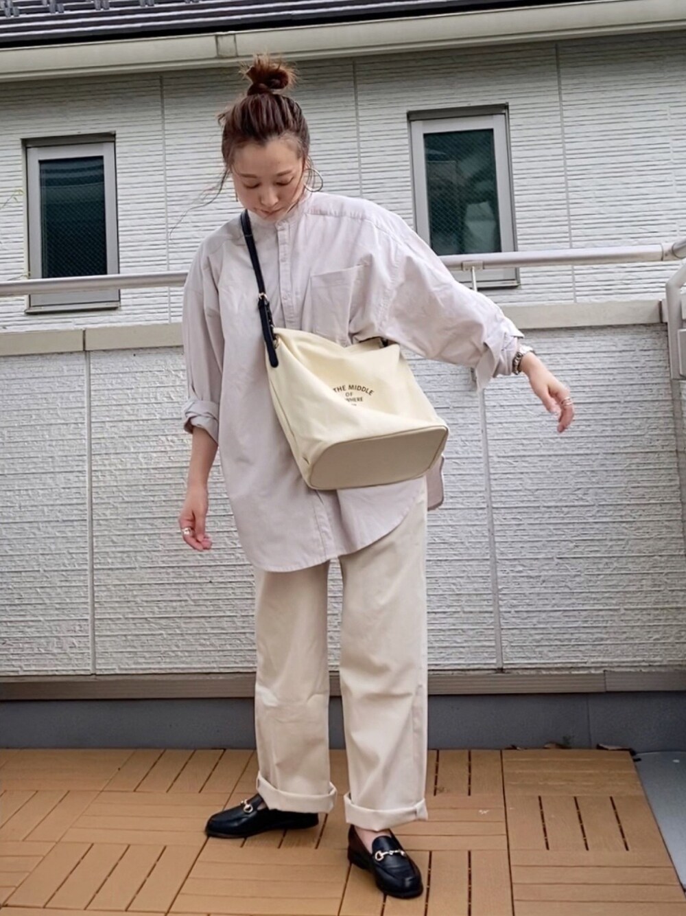 コーデュロイシャツ×チノパン✨ ゆるカジを斜め掛けとローファーで締めてみる☺️ SENSE OF PLACEのコーデュロイバンドカラーシャツ✨ オーバーサイズがこなれて可愛い😊❤️ 前を開けて羽織りとしても重宝します🙌 SENSE OF PLACEのエコレザービットローファー✨ エコレザーで軽くて柔らかいから履いてて楽ちんだしお値段以上のルックスです👀