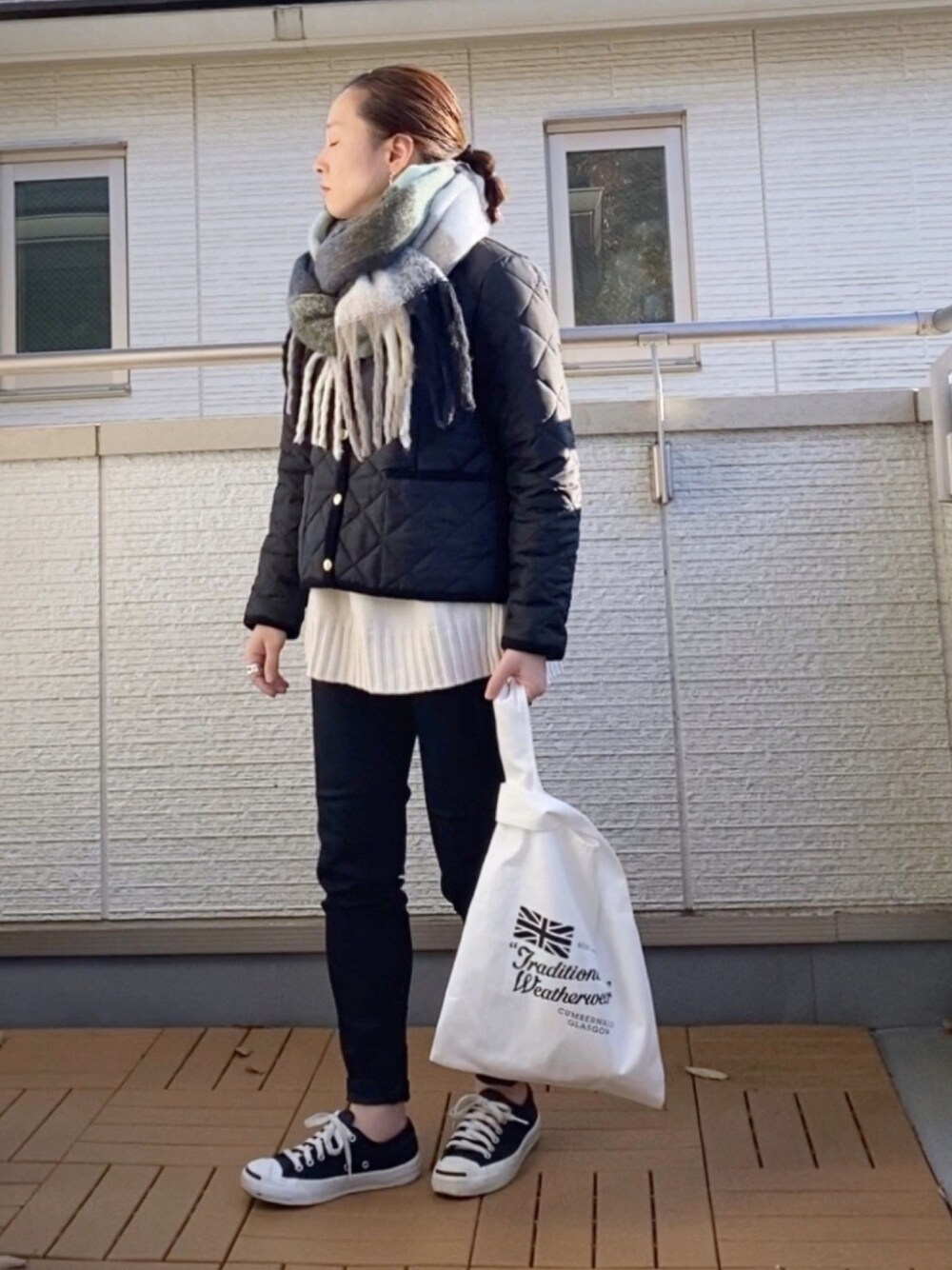 モノトーンにRiberryのチェック柄マフラーで差し色してみた😊✨ 色んなカラーが混じったキレイ色のマフラーだけどベースがブラックなので使い易い👍 本日Riberryの1000円クーポン出てます💁♀️✨
