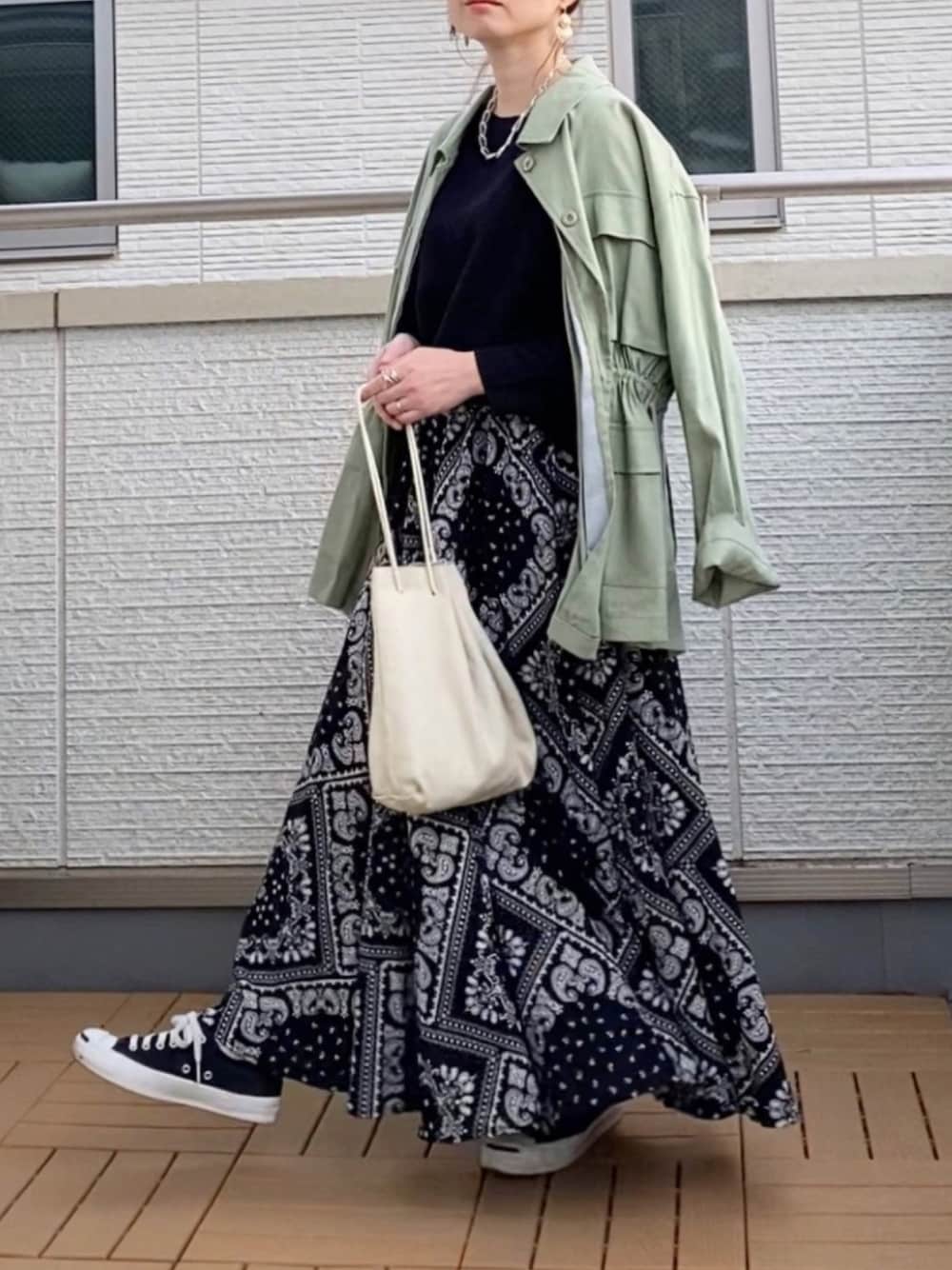 ECRIREのバンダナプリントスカート✨ ボリュームがたっぷりで歩くとふんわりする🥰 これからの季節カジュアルに履きたい一枚✨