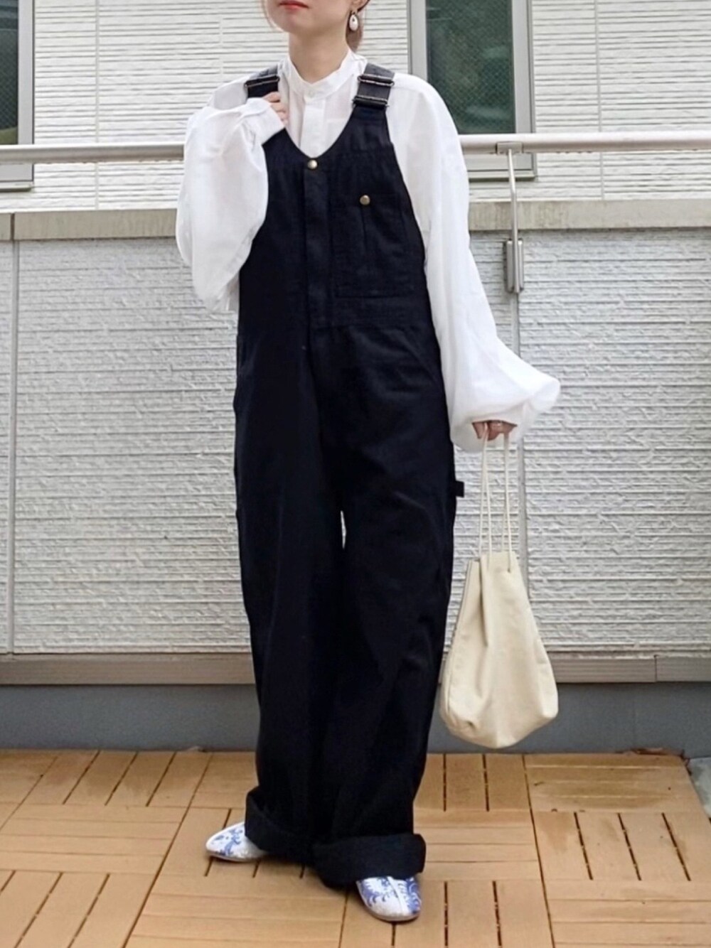 オーバーオールに袖ふんわりなブラウス😊 シンプルモノトーンにさりげなくチャイナシューズの柄を利かせてみた✨