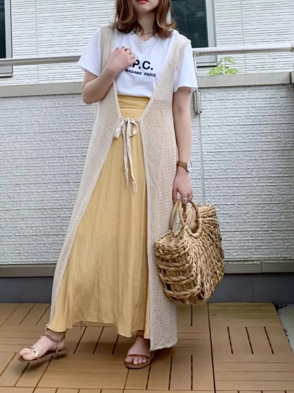 Shelly islandの2WAYメッシュ編みロングプルオーバー✨ 前後2WAYで着れるメッシュニット シンプルコーデに羽織るだけでコーデに変化がつく楽しい一枚😊 coen by SIZUのサテンフレアスカート✨ 明るくて華やかな夏っぽいベージュがツボ🥰 カジュアルに着れて使いやすい丈感◎