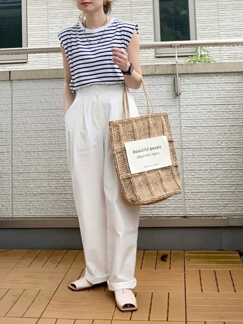 上下DHOLIC✨ お気に入りの肩パッド入りのトップスはボーダーTも持ってる😁 ハリ素材のタックパンツはシルエット最高🙌