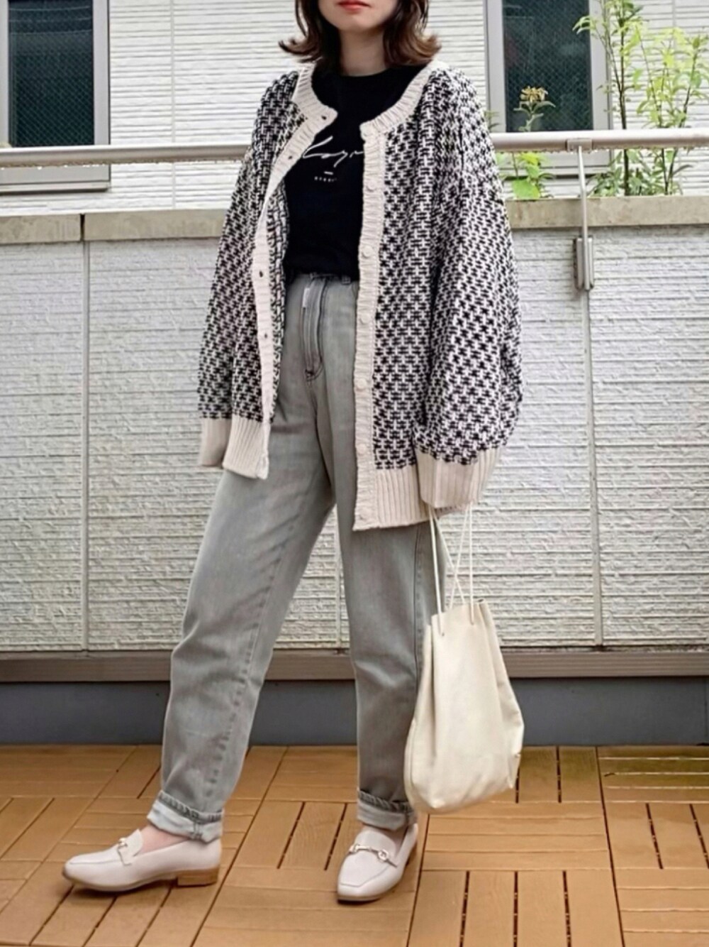 tiptopの前後2wayニットカーディガン✨ 去年から無地アイボリーを愛用してますが今期は新たに新色のジャガード柄をget😊 ボタンを後ろにしてプルオーバーニットとしても着れちゃう👍