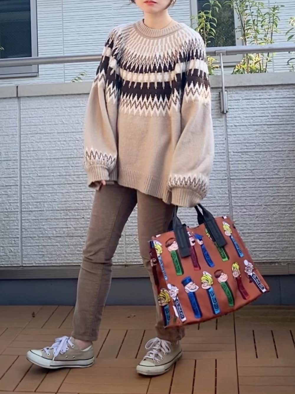 最近寒くてニットにもアウター合わせてたけどKRさん×CORNERSのノルディックニットやっと一枚で着れた🙌 これボリューム袖がめちゃ可愛いの😊 PEZトートの派手柄合わせてみた 柄on柄の相乗効果で可愛いくなってる はず・・😅 本日CORNERSの1000円クーポン出てます💁♀️✨
