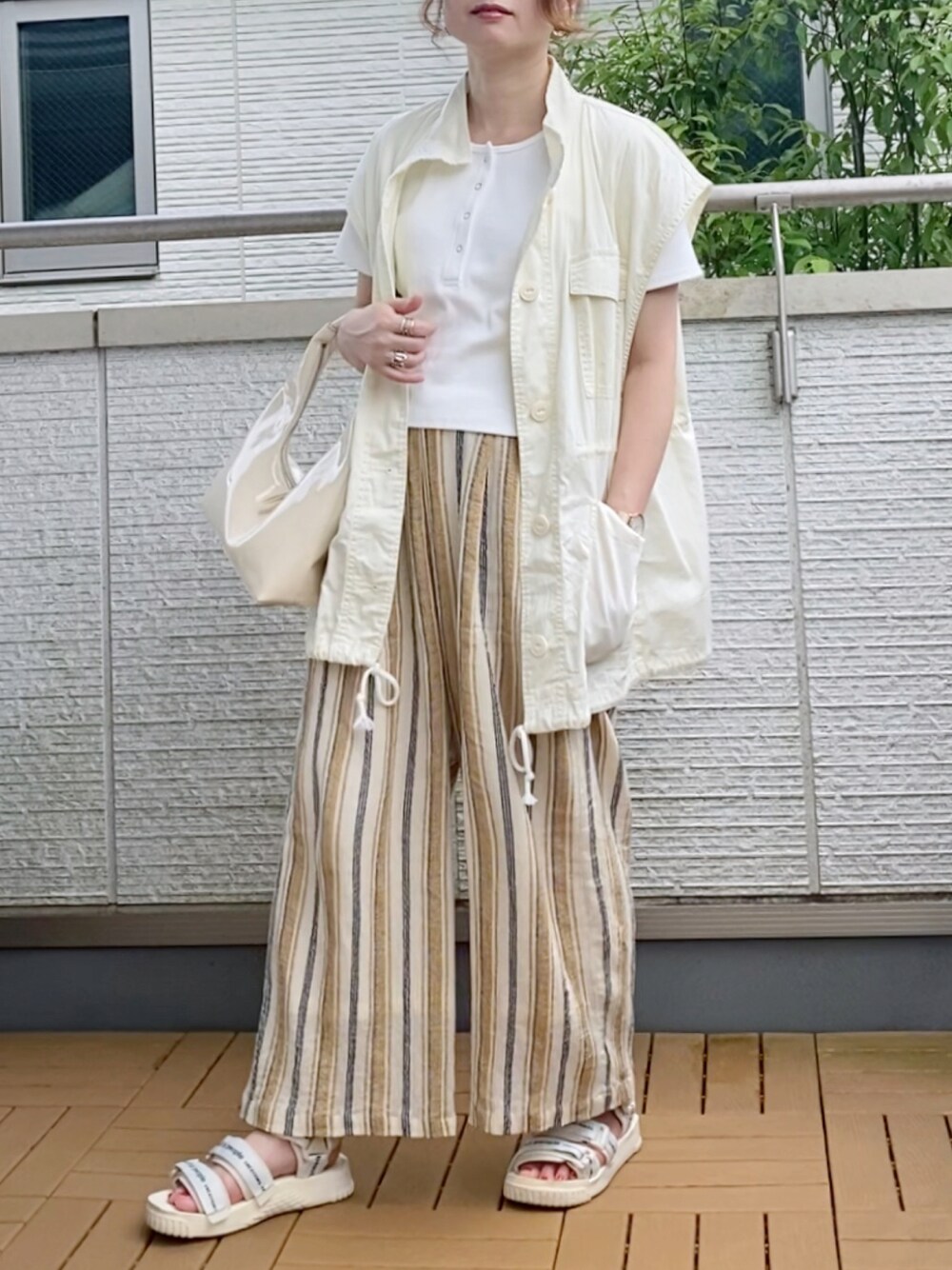 tiptopのミリタリーベスト✨ カーキも持ってますがホワイトも😊 今季はベストが気になってたくさん着てますがミリタリーテイストのものはカジュアル感がたまらない🥰 インナーに合わせたヘンリーネックのトップスもtiptopのもの✨ ショート丈はトレンドのハイウエストパンツと相性よくて◎ しっかりめの生地なので肉感を拾わないのも嬉しい🙌