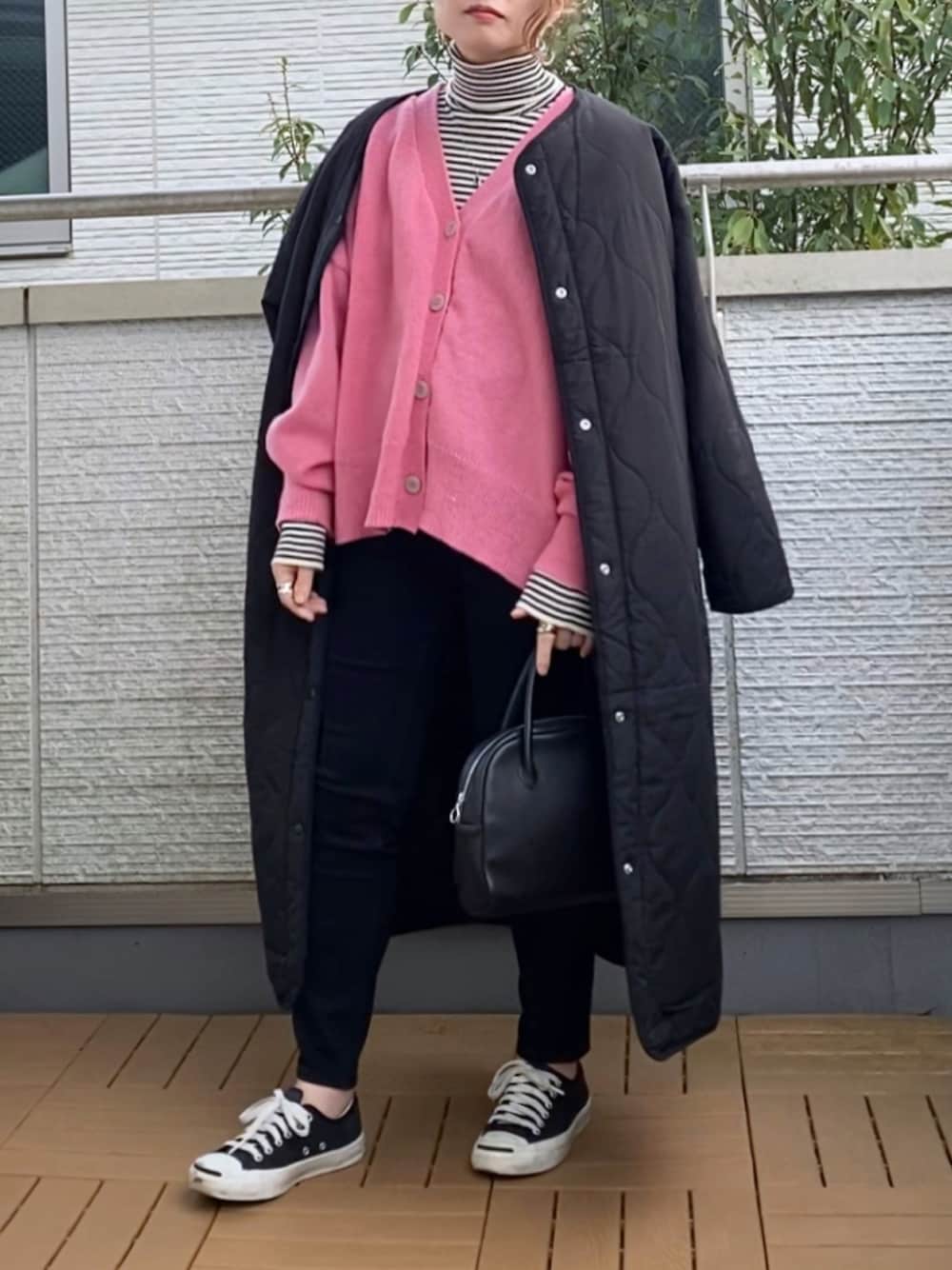 ECRIREのショート丈ニットカーディガン✨ モヘアのふわふわな質感にこのピンクの色味がツボだった🥰 色味が暗くなりがちな冬コーデだけどたまにはキレイ色も着たいよね💚 そして、 薄軽なキルティングコートはニットの上に着ると最強✌️ ロング丈でトレンドライクだし肩もこらないしでヘビロテ中😇