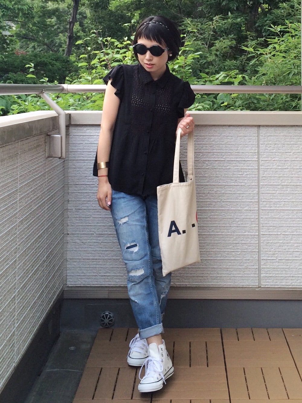 今日もタグコレお邪魔しまーす♪ 定番アイテムといえばこのダメージデニム 色合いとかダメージの入り方とかメチャお気に入りで登場回数多いので履き過ぎて伸びる→洗うをずっと繰り返してるけどまだ全然現役♡ あとは、白のコンバース… と行きたいところだけど、これは汚れるのが嫌で履いたらすぐ仕舞っちゃうから定番というにはビミョーかな…💦 それよかこのトート! ちょっと買い物に行くとかいう時に便利でついついヘビロテしちゃうやつ。 特に女性の方は何人かお気づきでしょうけど、これ雑誌の付録なんですよねー♪ でもそこはサスガのシャレオツおフランスブランドAPC♡中々侮れないです!! エー・ピー・シーじゃなくてアー・ぺー・セーですから凄いです😂😂 これ使ったコーデ過去にトップに2回、それに30選にも載っちゃったラッキーアイテム😁✨ 今回はこれに黒のレースブラウスで大人可愛い感じ狙ってみたんですが、 ですが、 どんな感じですかね…😅 それでは皆さん良い一日を(∩´∀`)∩✨
