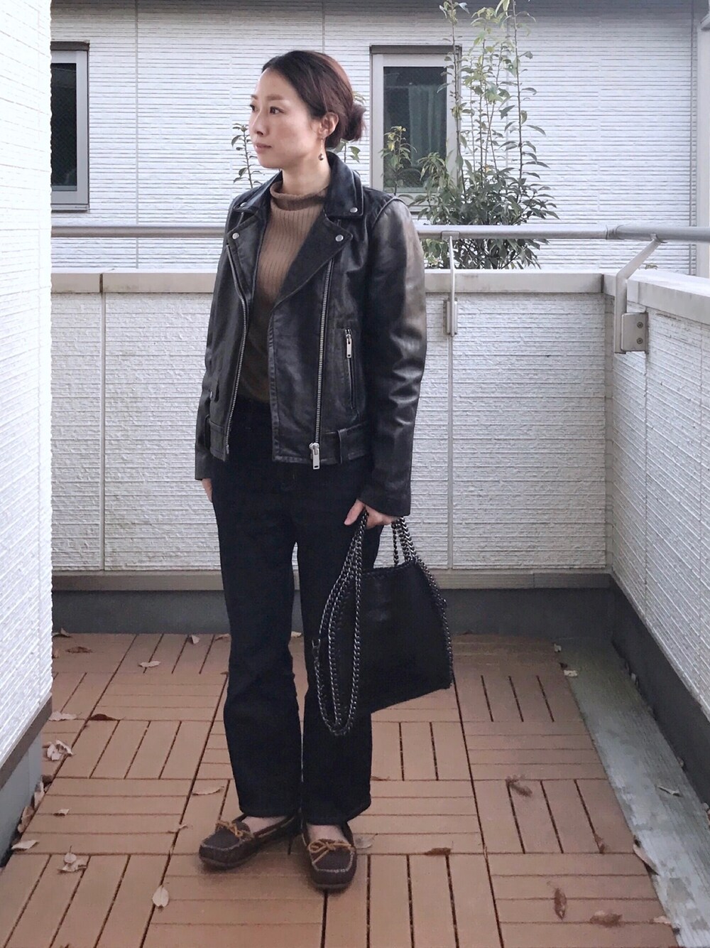 ライダースとチェーンバッグのハードさをモカシン合わせで女子っぽく😌