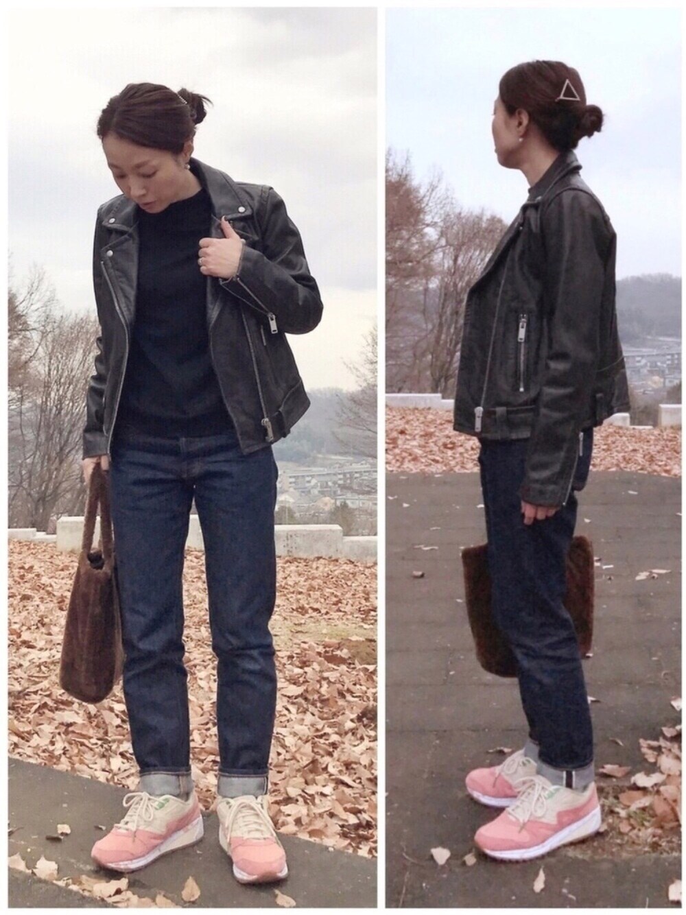 ライダースをピンクのSauconyともこもこトートで女子っぽく☺️