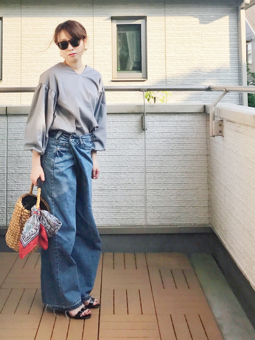ふんわり袖のブラウスをリメイク風のワイドデニムでカジュアル&辛口に😊