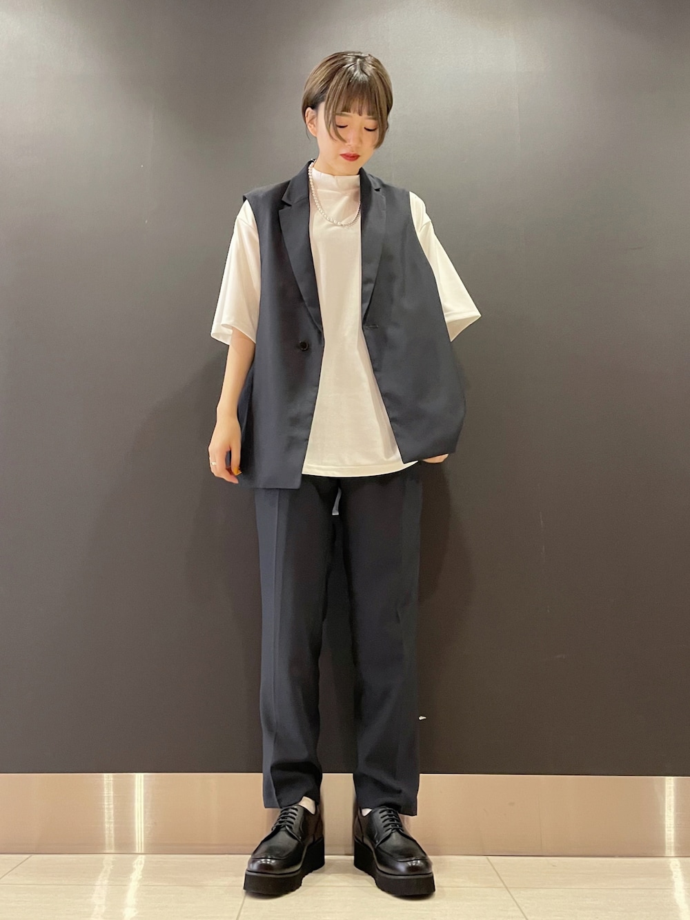 トレンドのジレを使ったセットアップスタイル。 インナーはTシャツでもシャツでも楽しめます!