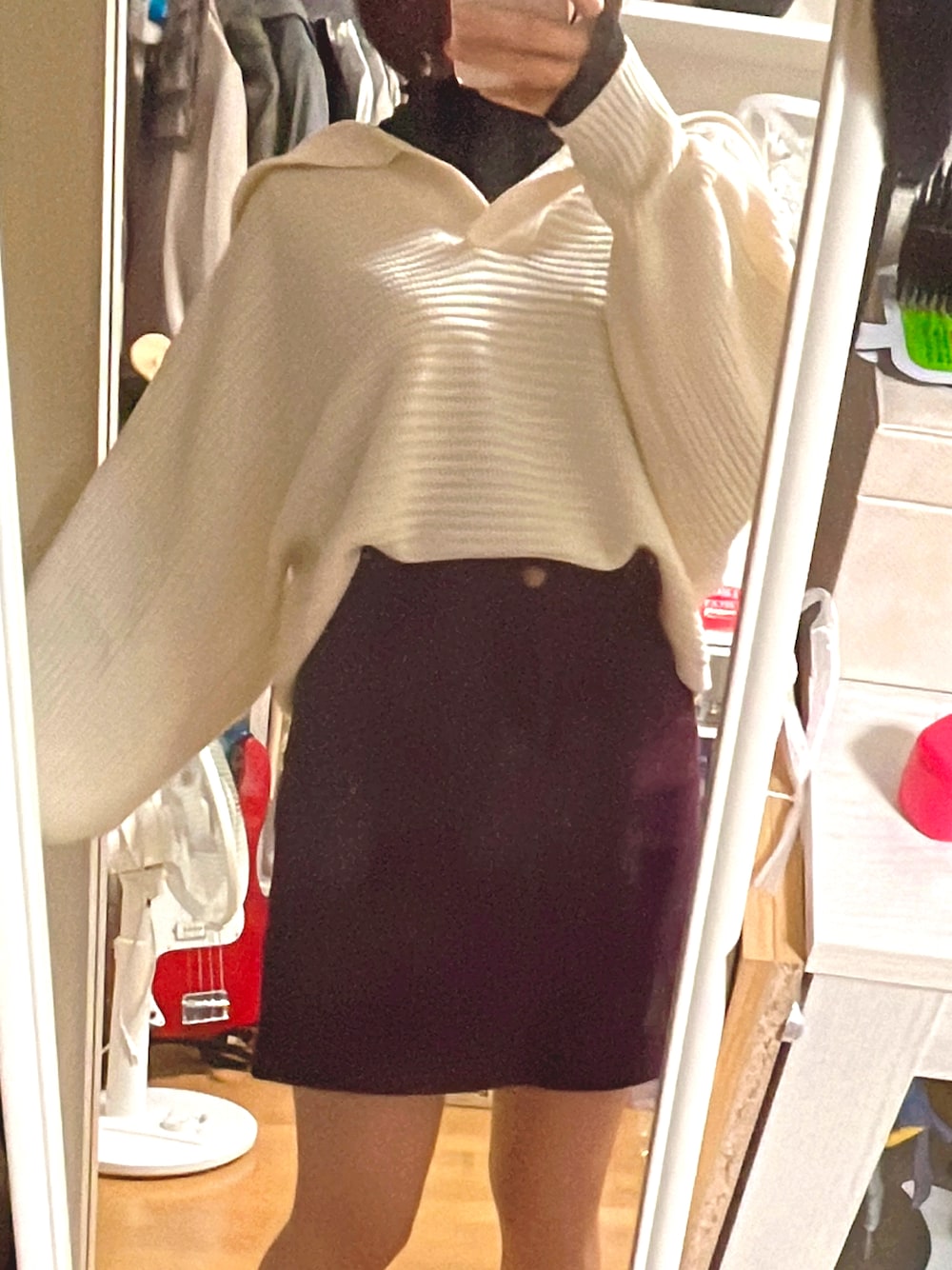 前回に引き続きFUNで購入したセーラーカラーニットの1人ファッションショー ワインレッドのコーデュロイスカートがかわいい☺️