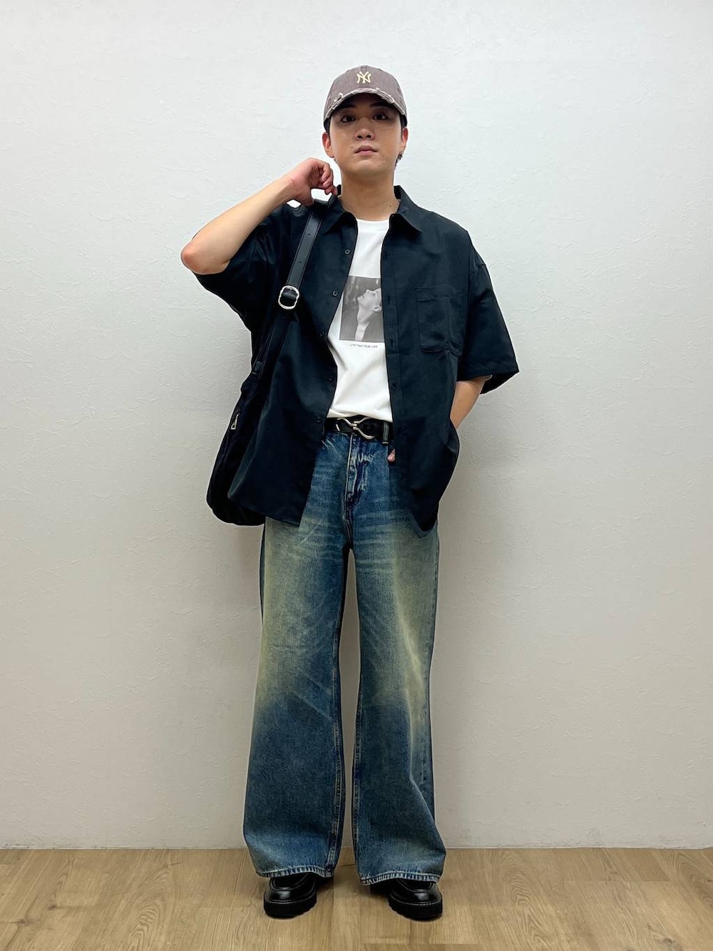 カジュアルコーデ✨ フロントプリントをシャツのインナーにするのが今っぽくていい感じです😎