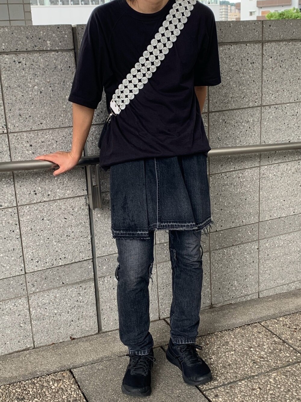 kamarovのデニムパンツ「Sacai Slim-Fit Distressed Stonewashed Denim Jeans With Detachable Apron」を使ったコーディネート