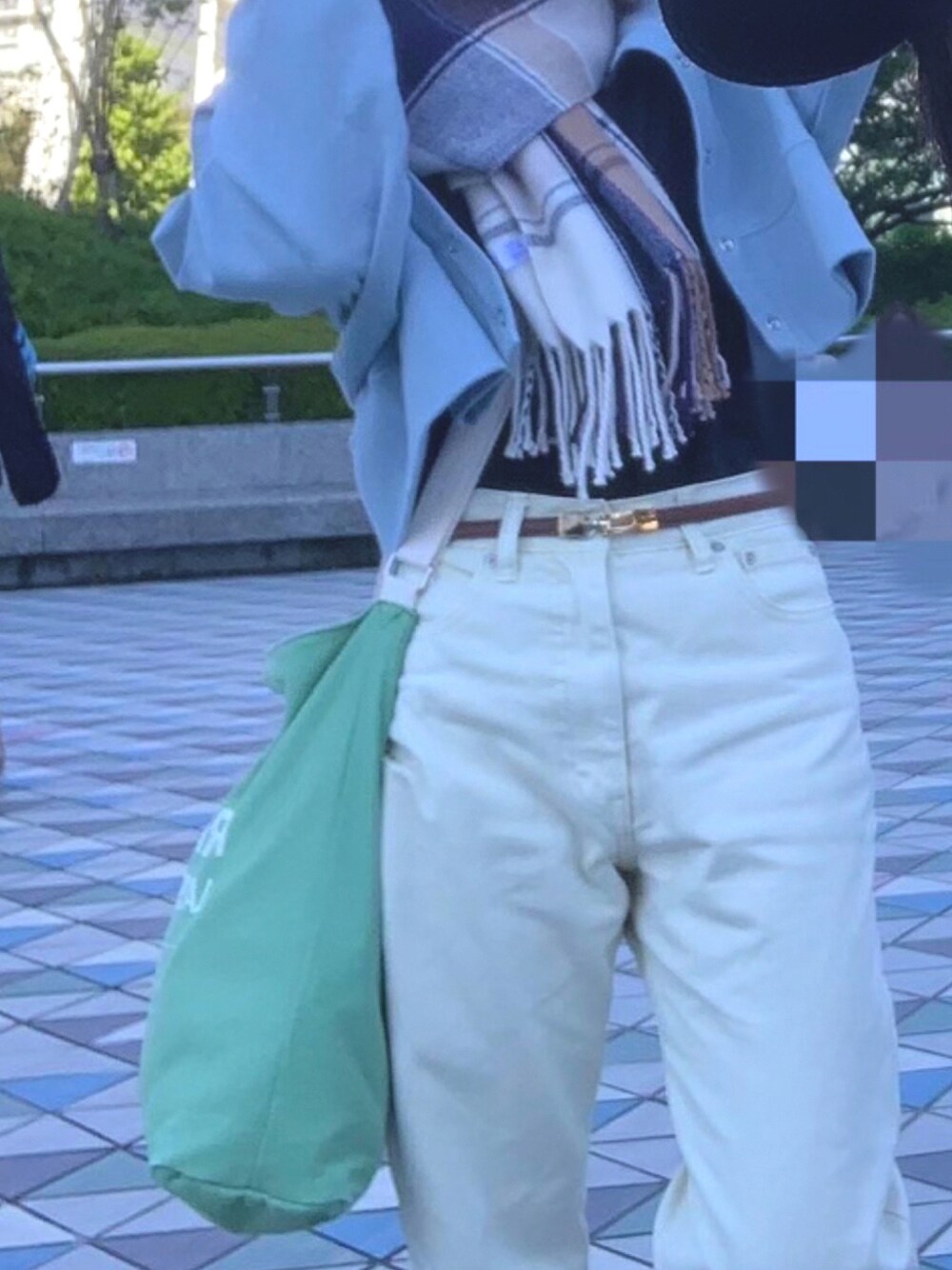 晴れの日は爽やかカジュアル👍 マフラー買って良かった〜😄大判なので肩がけ、ブランケット、首に巻く事が可能〜。使い勝手が良いです🎃