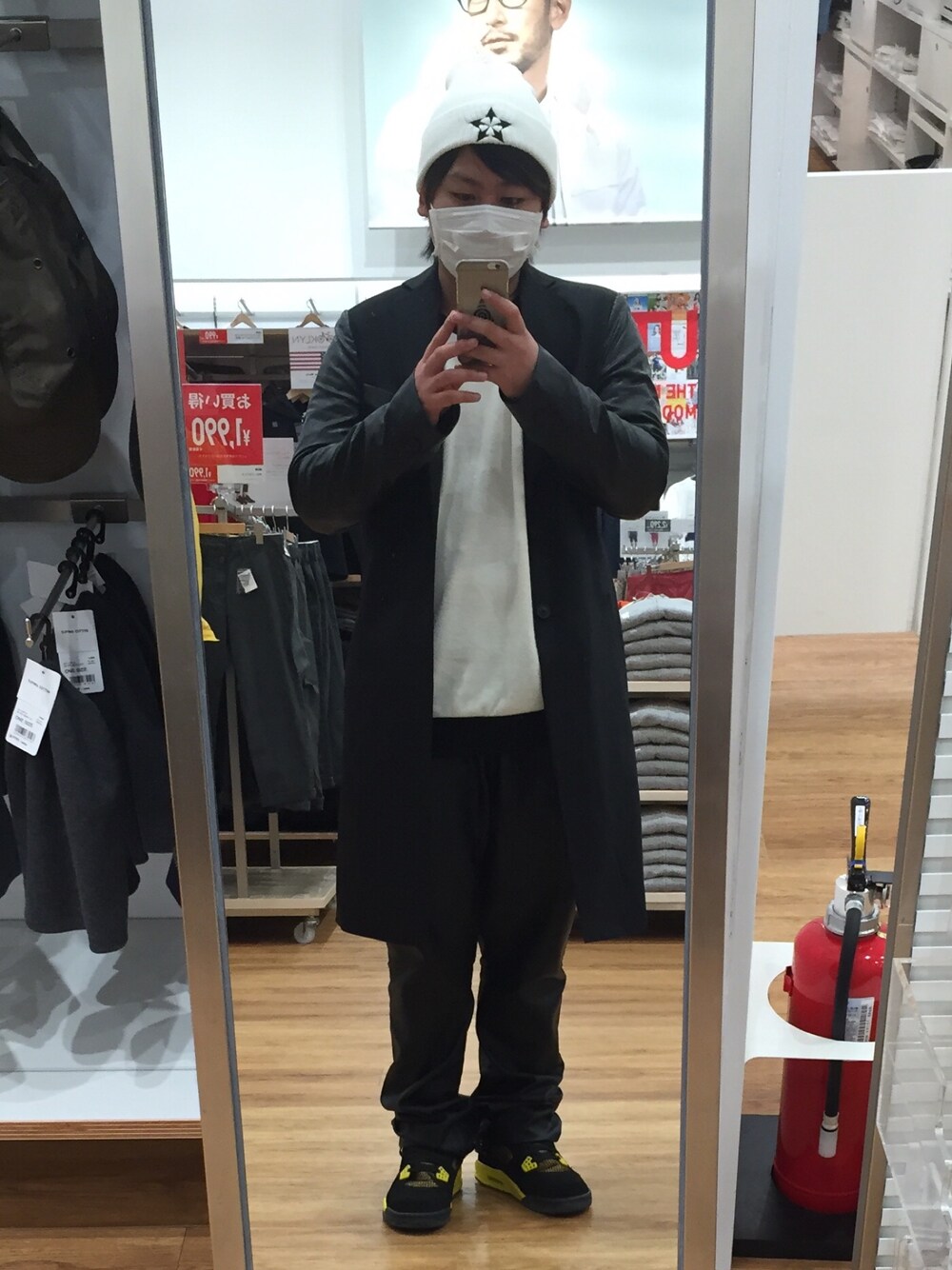 REBTRAITのロングコート.ドルマンニット.レザーイージーパンツ.ニット帽にJORDANのサンダーを合わせました♪