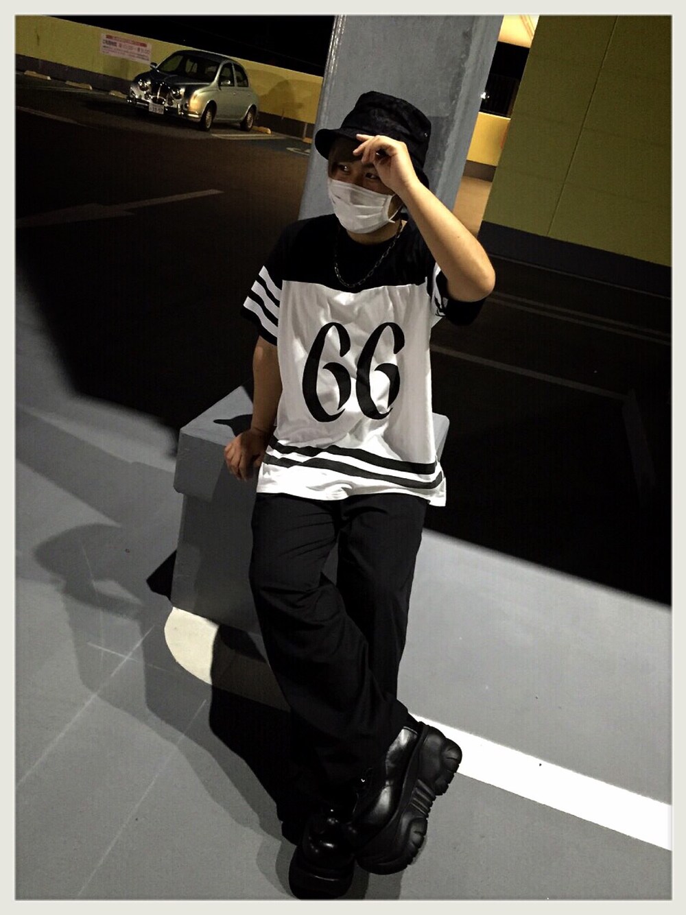 REBTRAITのバケットハット.ナンバリングビックT、アンダーグラウンドの袴パンツ、デモニアの厚底です♪ ビックTと袴パンツでユルさを出しました◎ デモニアの厚底は12㎝身長が高くなる優れ物です!個性的な品◎
